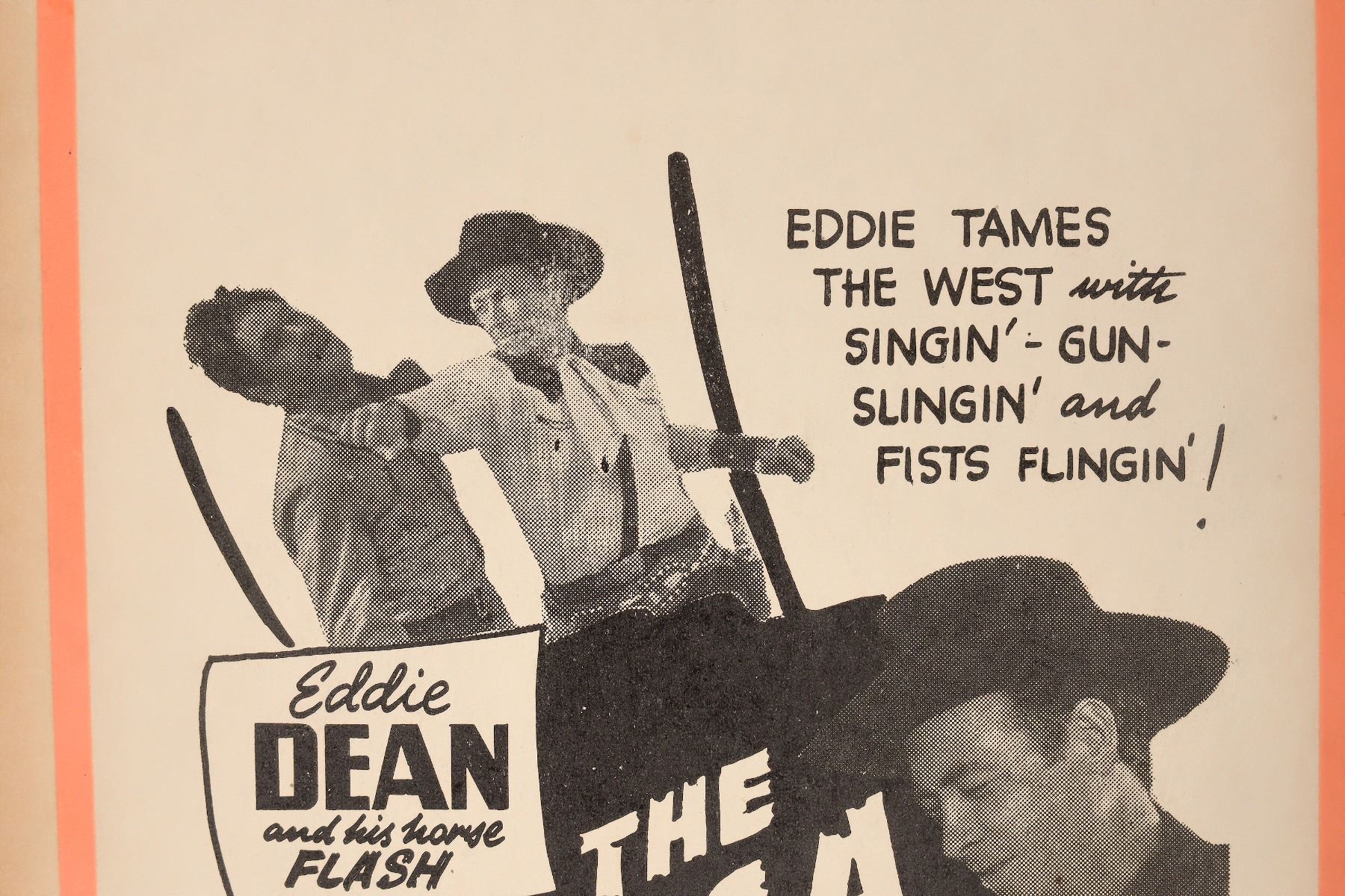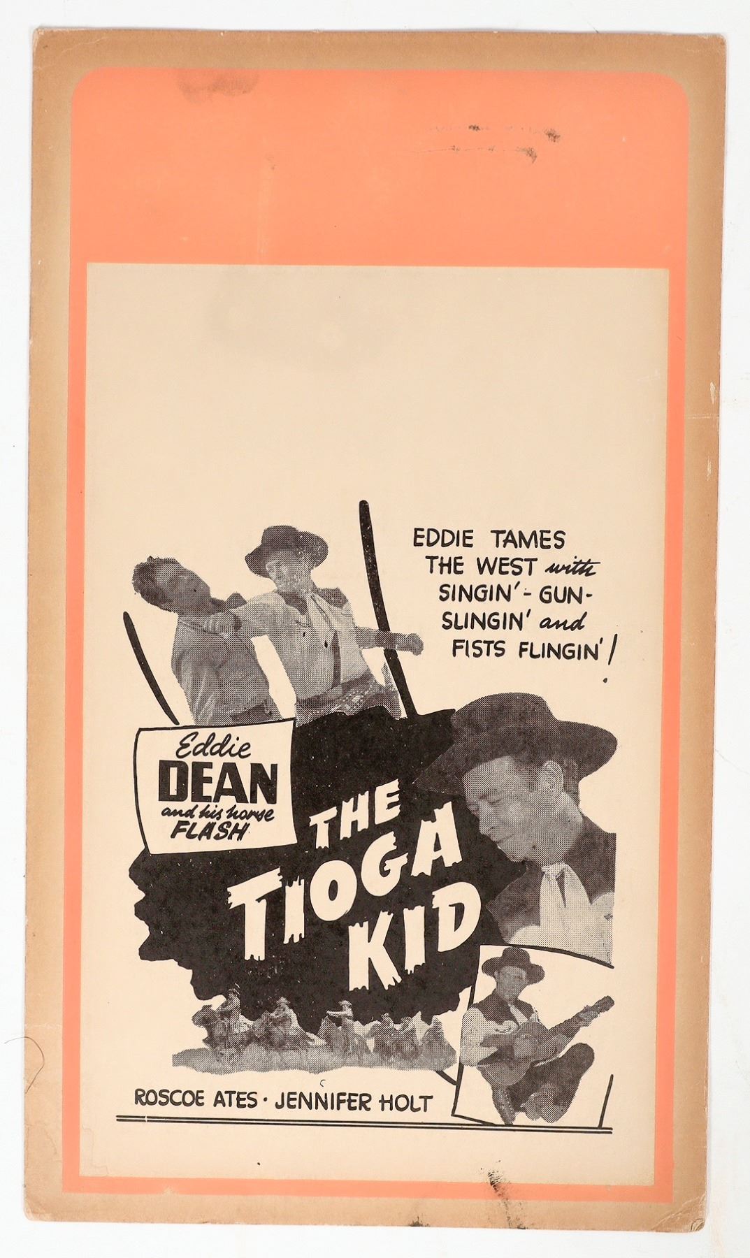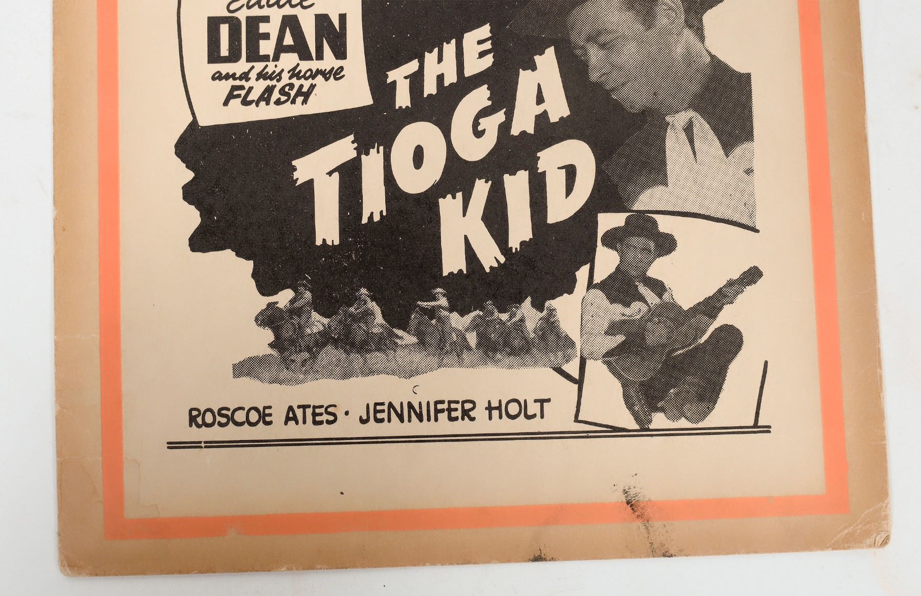 The Tioga Pass movie poster without a listed theater. 13x7". The Tioga Kid is a 1948 American Western film directed by Ray Taylor and written by Ed Earl Repp. The film stars Eddie Dean, Roscoe Ates, Jennifer Holt, Dennis Moore, Lee Bennett and William Fawcett. Some light stains, please inspect.