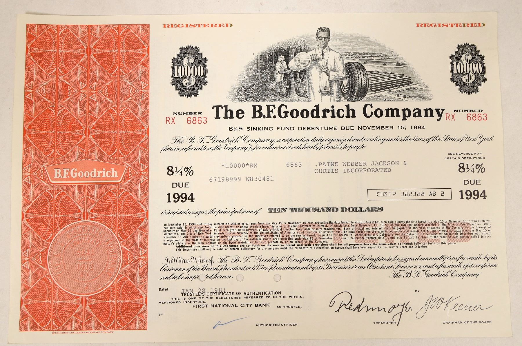 Assorted auto tire stocks and bonds. B F Goodrich bonds-2x 1982 mauve, 1x 1982 brown, 2x 1994 orange, 1x 1994 violet, 2x 1994 tan, 1x 1994 yellow, 2x 1994 brown. 2x 1916 La Zacualpa-Hidalgo Rubber, 1921 Hydro-United Tire. Keystone Tire and Rubber-2x 1926 brown, 2x 1925 blue.