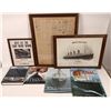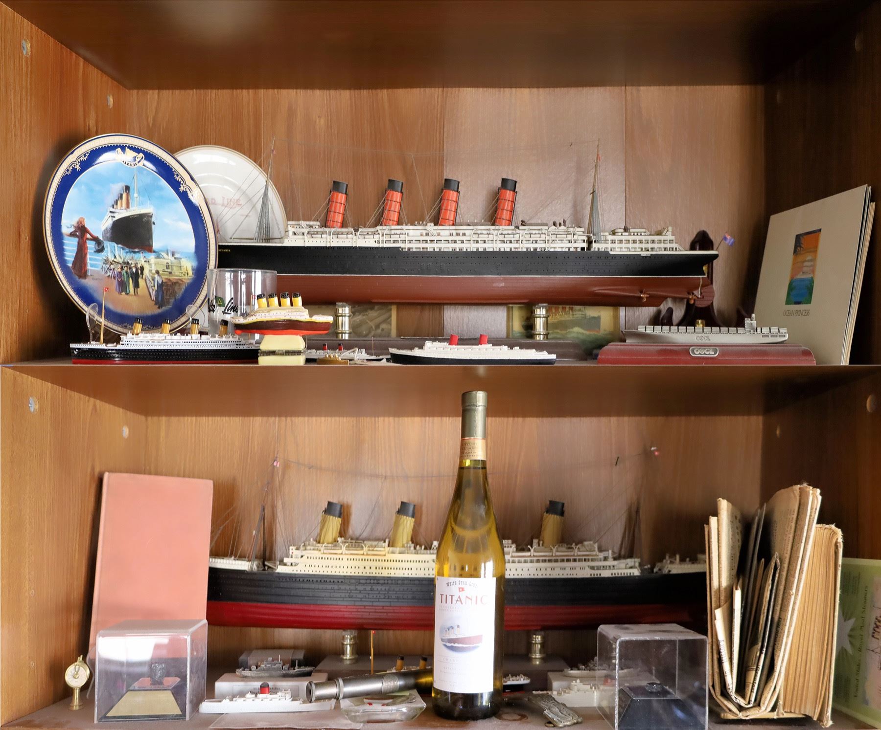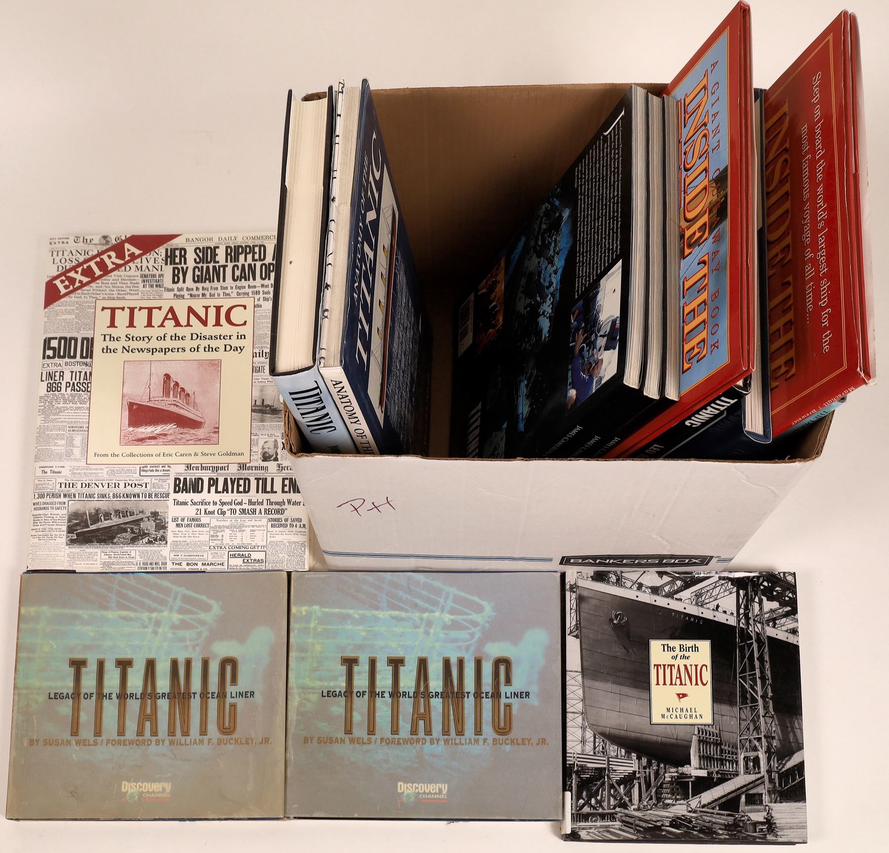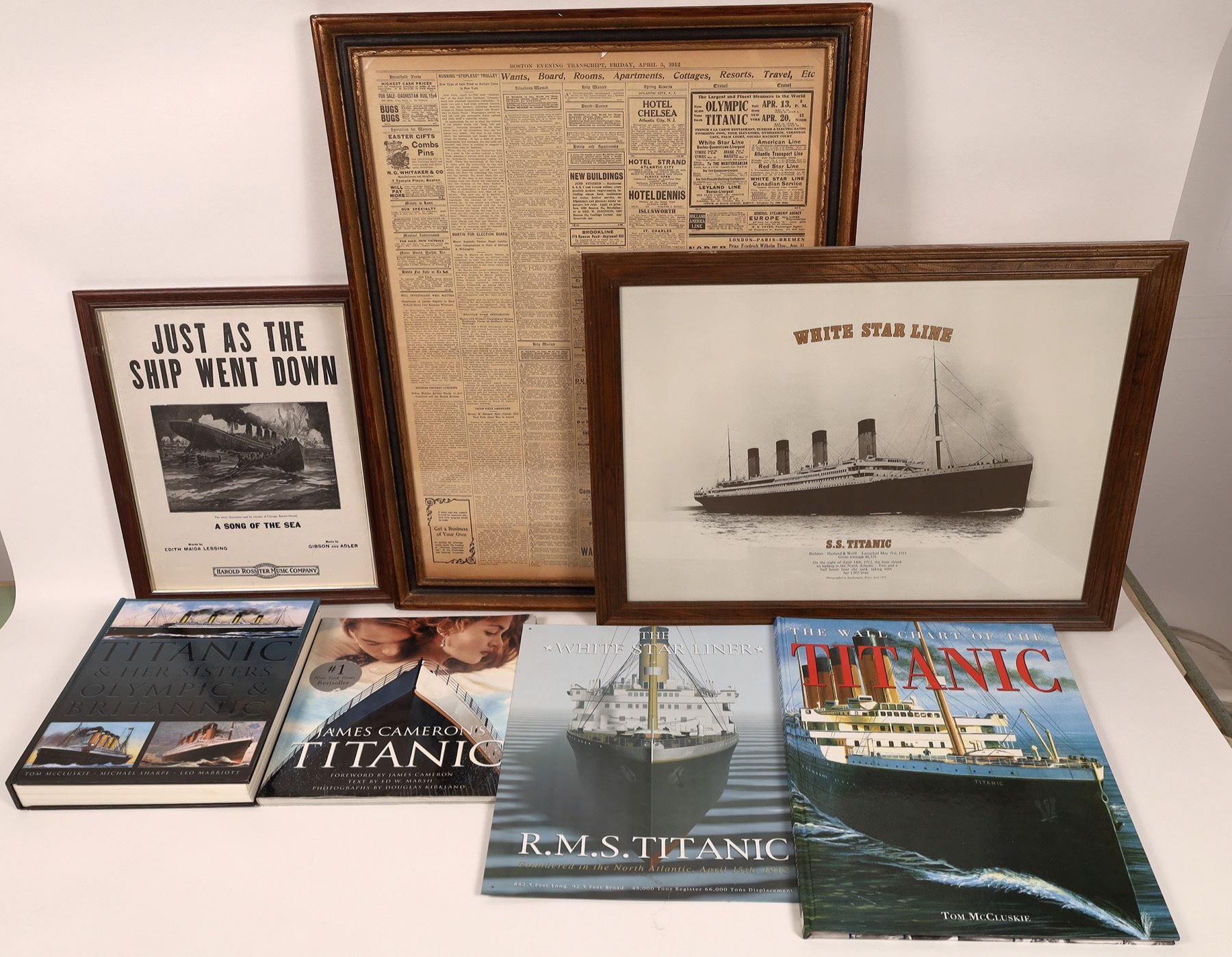 2 large ship models 24-30" each; 8 desktop paperweight models 4-9" each; Cunardline plate souvenir china; 2 pieces of coal from the titanic; a book "the Sinking of the Great Titanic and Sea Disasters;" Titanic libray including about 25 or so books; numerous reproduction pieces; commemorative bottle of titanic wine by Century sellers; 2 framed posters; two very atrractive reproduction brass pieces; original newspaper with an ad for the titanic in 1912 before it sunk!