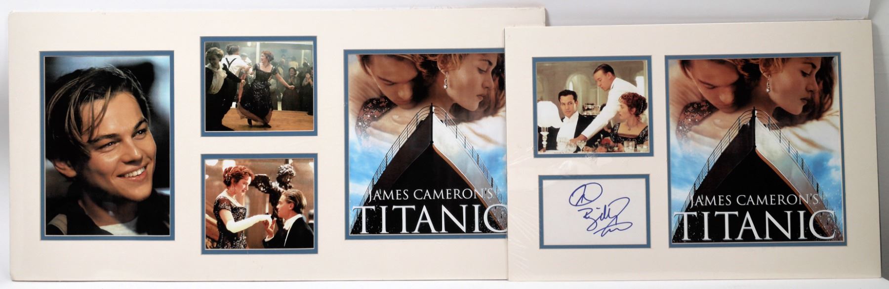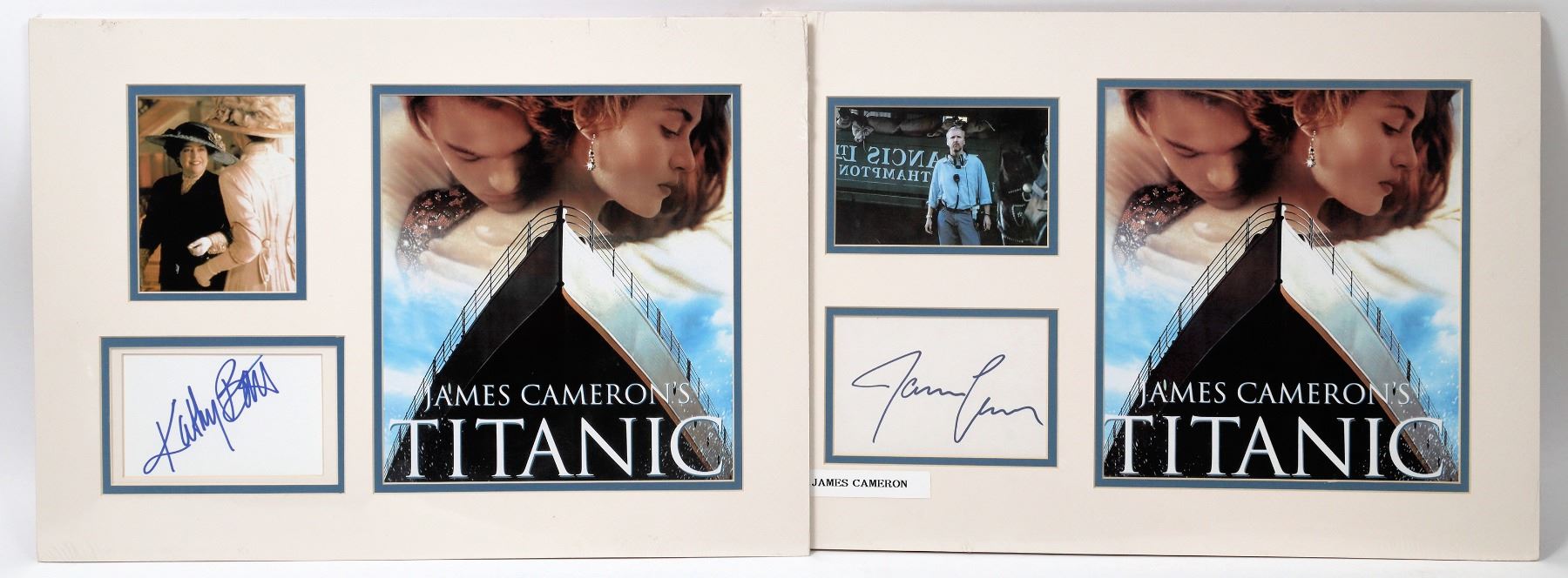 4 matted Titanic movie photos. 3 with autographs from Billy Zane, James Cameron, Kathy Bates -all 14x20. 1 with unsigned scenes 15x30".