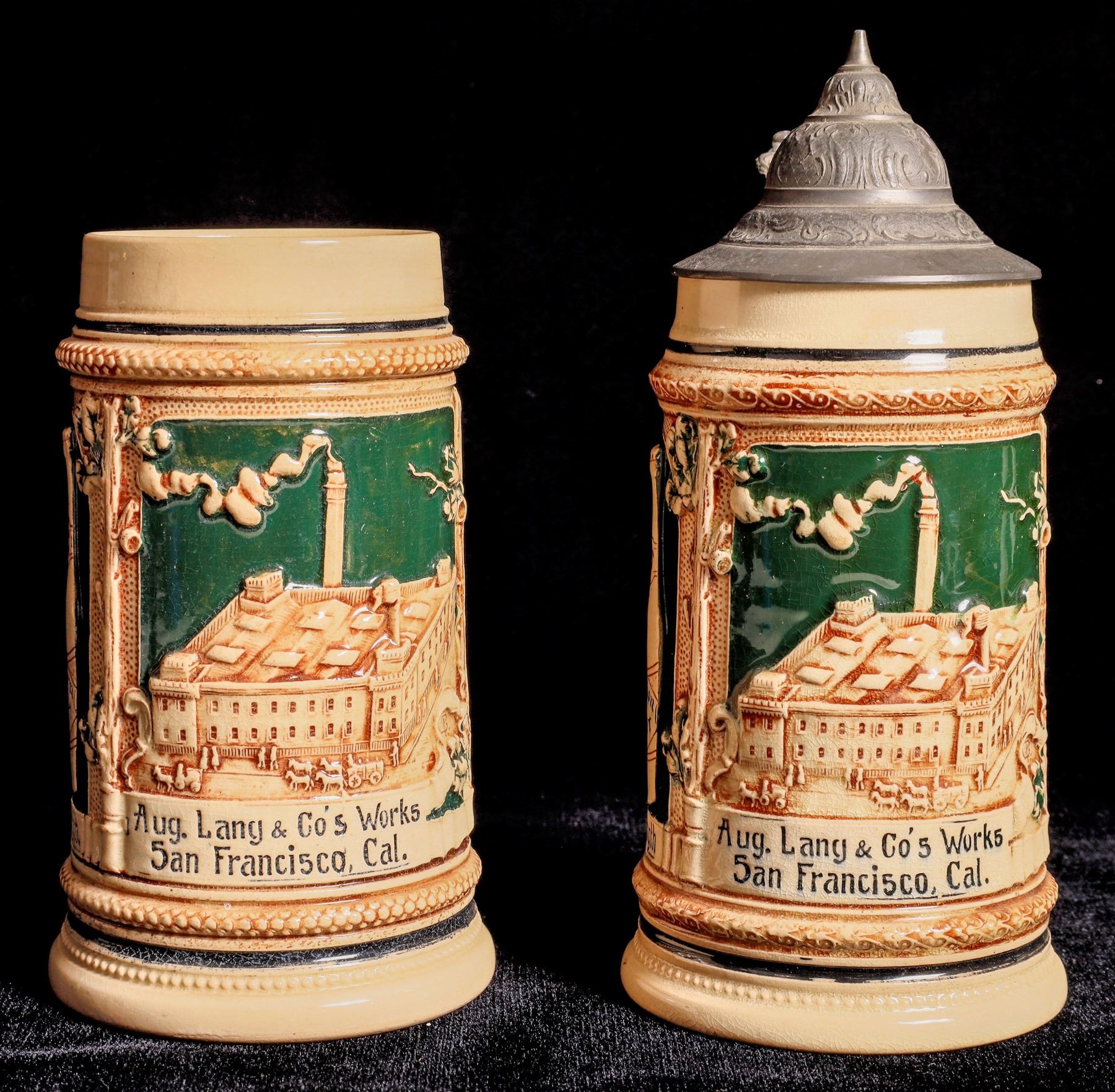 Very rare matched pair of Tivoli Lager Beer/Red Lion Stout//Aug. Lang & Co's Works/San Francisco, Cal. Beer steins. "As stated in August Lang's biography, after the earthquake and fire of 1906, he bought out brothers, Otto and Leonhard, to form August Lang & Co. He then built a bigger and better bottling works at 18th and Alabama Streets, which covered one square block. While company was still the primary bottler for the Fredericksburg Brewery, it now added their own brand of beer to bottle and distribute. It was called Tivoli Lager and it was made for them by Fredericksburg. It first went on sale on November 7, 1908." from brewerygems.com. 8' tall with lid, 1 is missing the lid. Made in Germany. No apparent chips or cracks. San Francisco California c. 1908