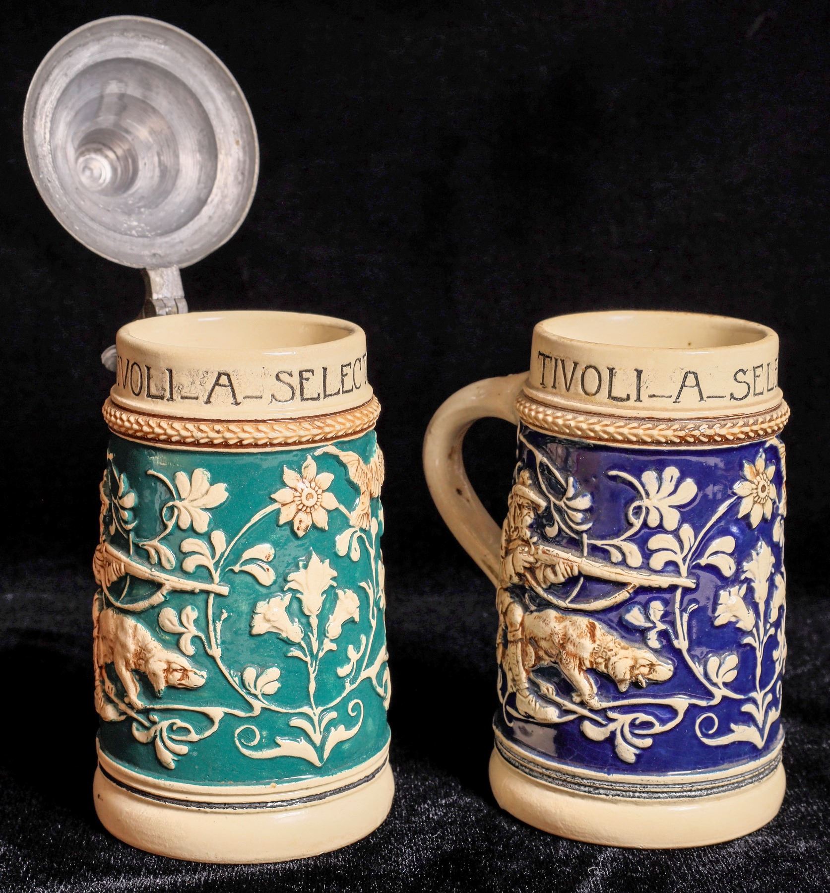 Matched pair of embossed hunting themed Tivoli-A-Select-Lager c. 1908-15 beer steins from Aug. Lang Brewing Co. of San Francisco. "As stated in August Lang's biography, after the earthquake and fire of 1906, he bought out brothers, Otto and Leonhard, to form August Lang & Co. He then built a bigger and better bottling works at 18th and Alabama Streets, which covered one square block. While company was still the primary bottler for the Fredericksburg Brewery, it now added their own brand of beer to bottle and distribute. It was called Tivoli Lager and it was made for them by Fredericksburg. It first went on sale on November 7, 1908." from brewerygems.com. Made in Germany, 6.25" tall with lid. One is missing the lid. No apparent chips or cracks. San Francisco California c. 1908-1915
