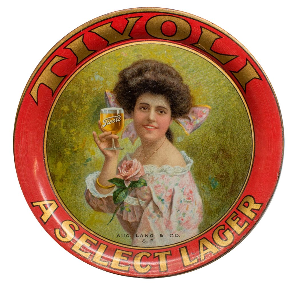 Red rim with gold lettering: "Tivoli. A Select Lager." Vignette of smiling brunette with pink floral dress holding a Tivoli beer glass. Aug. Lang & Co., S.F. Measures 4 1/4" diameter. Nice condition! Burt Collection