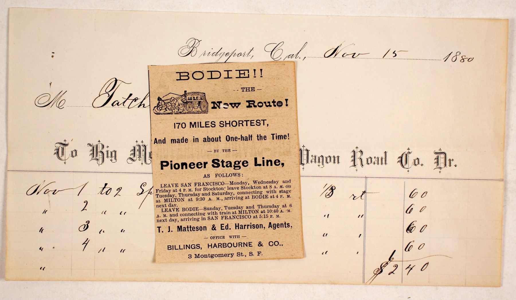 Bridgeport, Cal billhead and Pioneer Stageline Bodie advertisement Date: 1880 City: Bodie State: California HWAC# 76049
