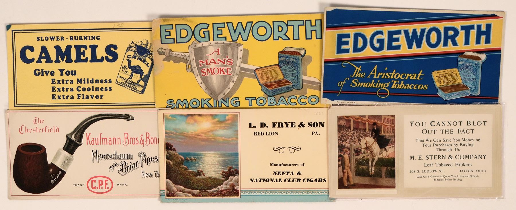 Unique grouping of tobacco advertising blotters. Includes one blotter for Camel cigarettes, "Slower Burning...Gives you extra mildness, extra coolness, extra flavor." Also includes two blotters advertising Edgeworth Smoking Tobacco. Artwork on this grouping includes tobacco, cigarettes, a cigar, an ocean scene, and a woman on horseback. The blotter featuring the woman on horseback is an advertisement for M.E. Stern & Co. Leaf Tobacco Brokers and the artwork is signed by Max Klepper.