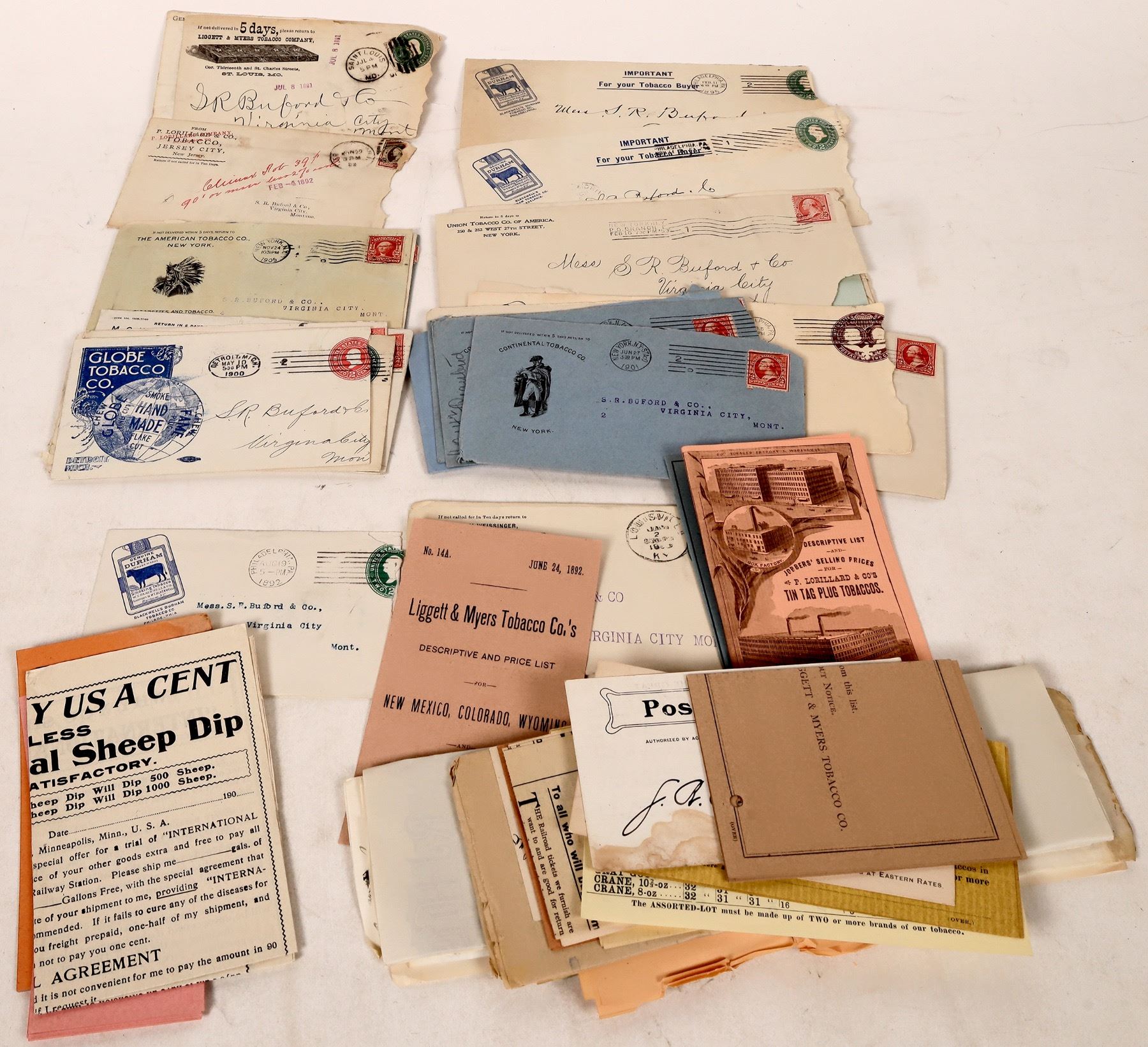 About 25 tobacco covers to SR Buford, some with corner advertising, some with contents and price lists, c. 1891-1905. Blackwell's Durham Tobacco, American Tobacco, Griggs Bros., Liggett & Myers, Gem City, Globe Tobacco, Continental Tobacco etc.