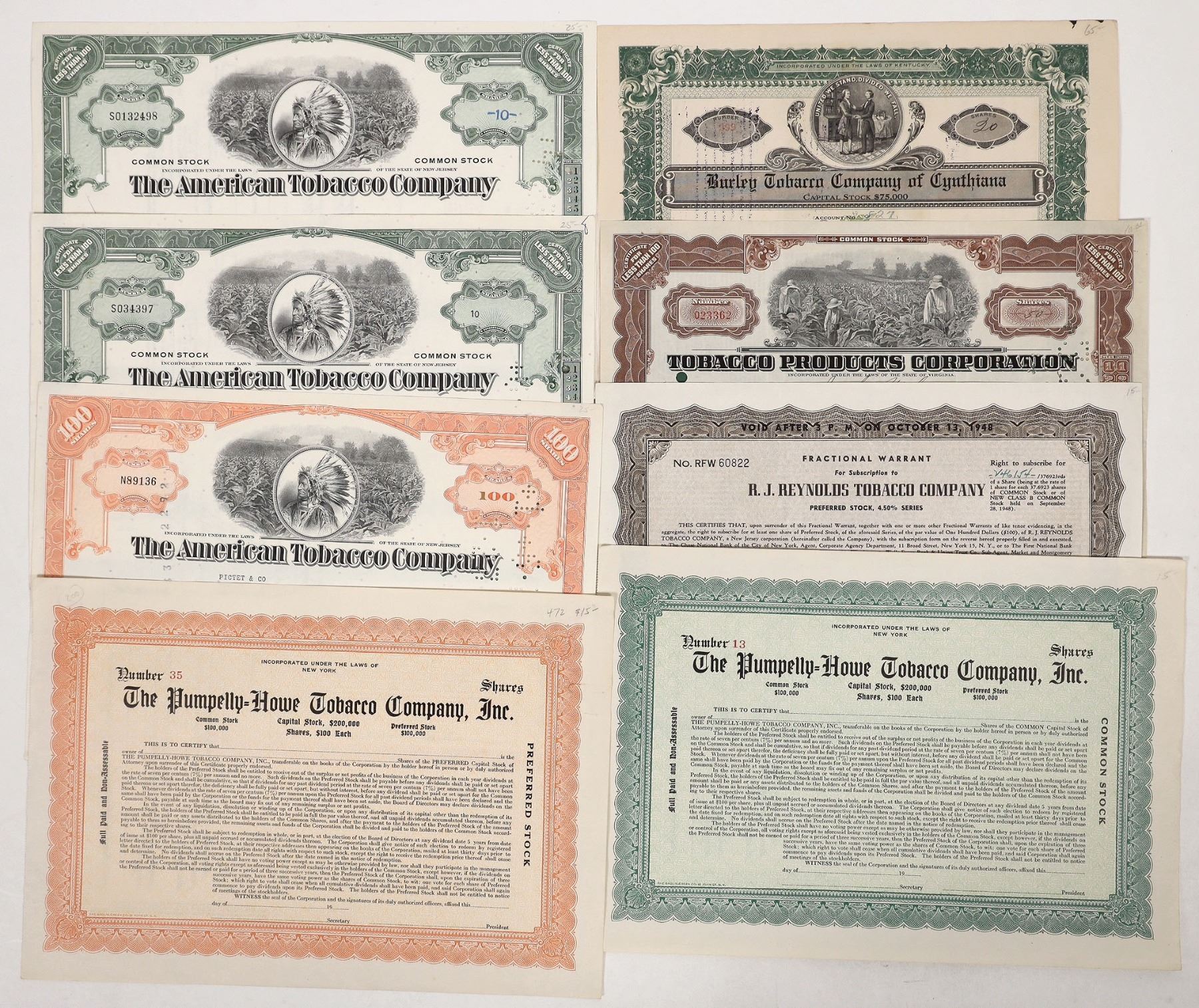 A collection of 8 stock certificates from various tobacco companies, dated 1919 to 1969. These companies are the Burley Tobacco Company of Cynthiana, Tobacco Products Corporation, R.J. Reynolds Tobacco Company, Pumpelly-Howe Tobacco Company (2), and the American Tobacco Company (3). 6 certificates are issued, 2 are unissued. A few are cancelled with hole-punch cancellations. Several have interesting vignettes, including two vignettes depicting tobacco fields.