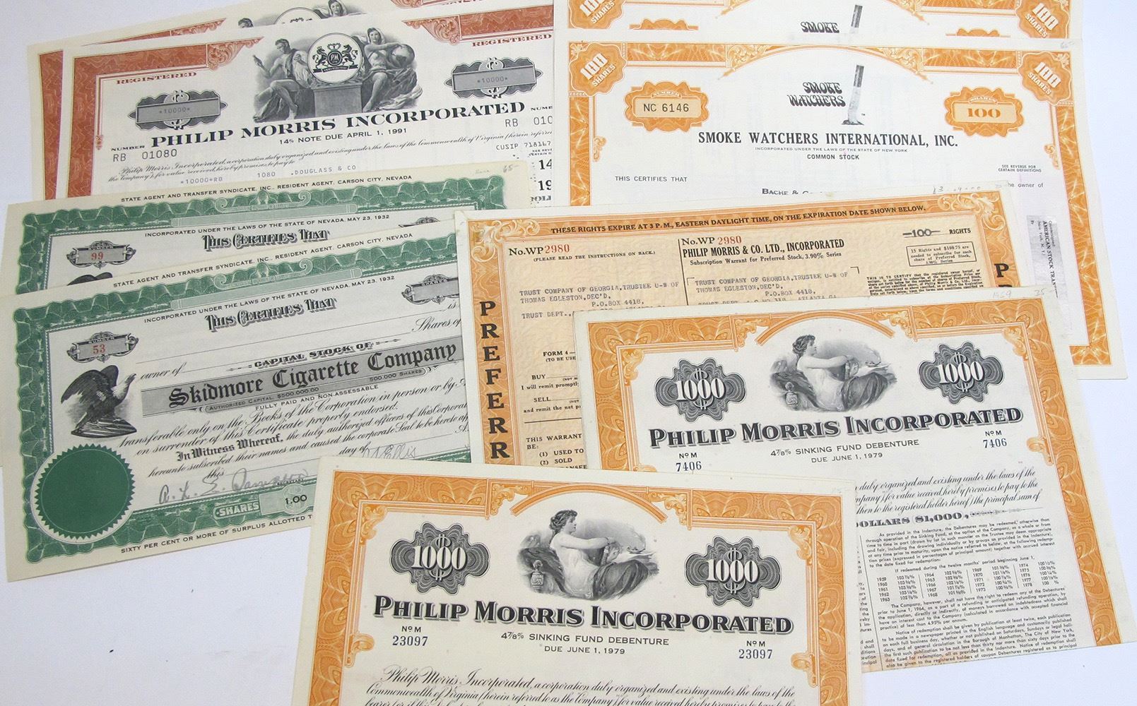 Group of 9 tobacco stocks and bonds. 1) Philip Morris warrant exp 1950 to Trust Co. of Georgia. 2) 2 Philip Morris bonds, 4 7/8%, # 23097 and 7406 $1000 3) 2 Smoke Watchers Intl. i/u to Bache & Co. 1972 100 shares #6146 and 6147 4) 2 u/i Skidmore Cigarette Co #53 and 99 5) 2 Philip Morris 14% notes Date: Location: HWAC # 54636