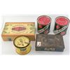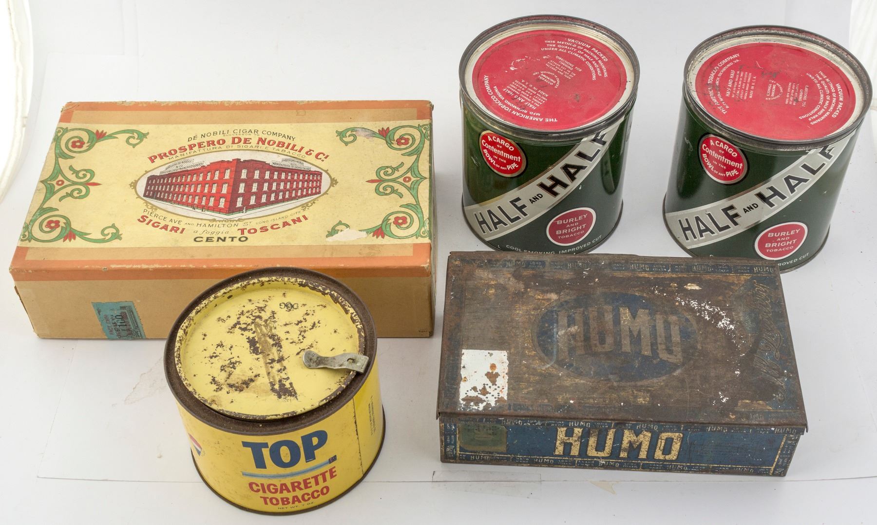 Tins- 2 from Half and Half, Burley and Bright Tobacco. Humo- wear on lid. Top Cigarette Tobacco. Cardboard box from Prospero de Nobili & C!.`