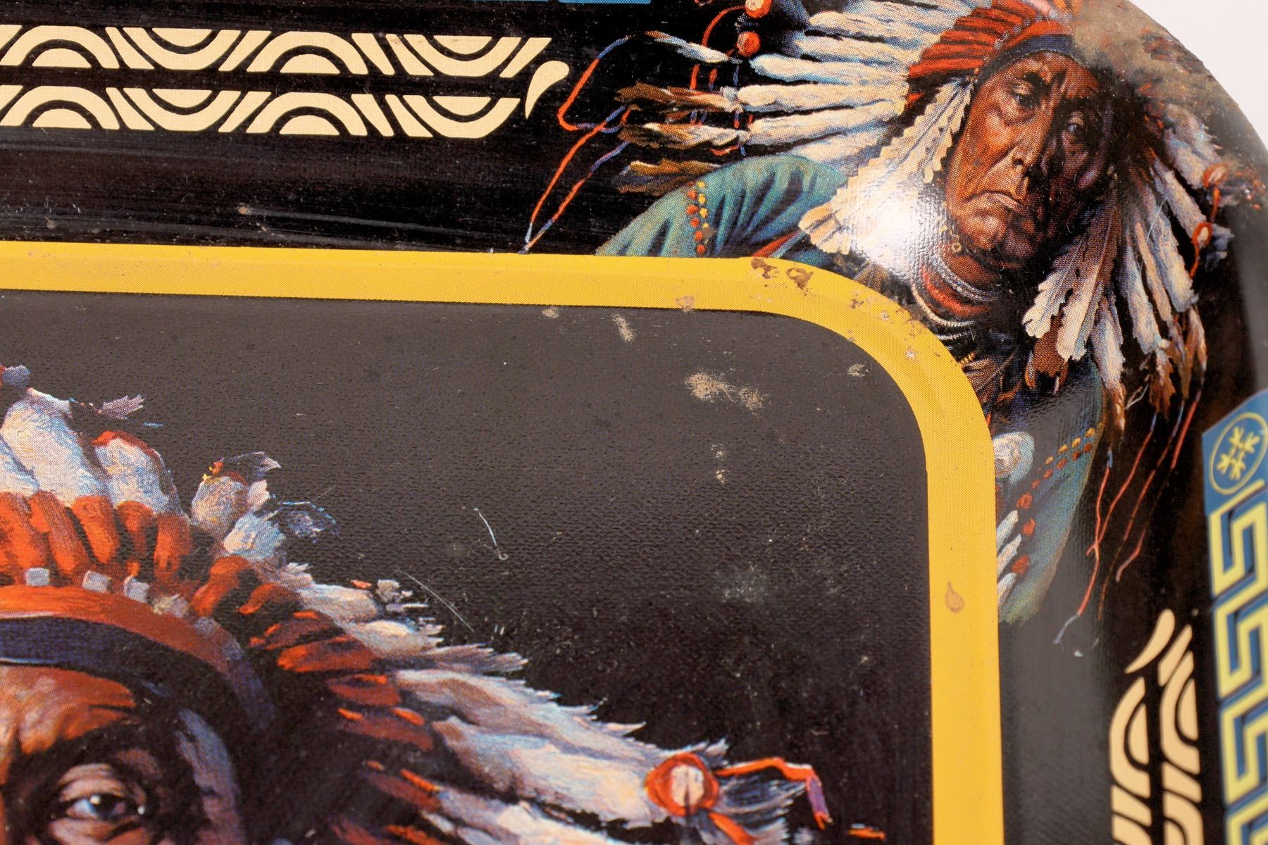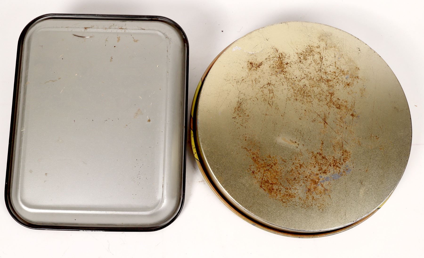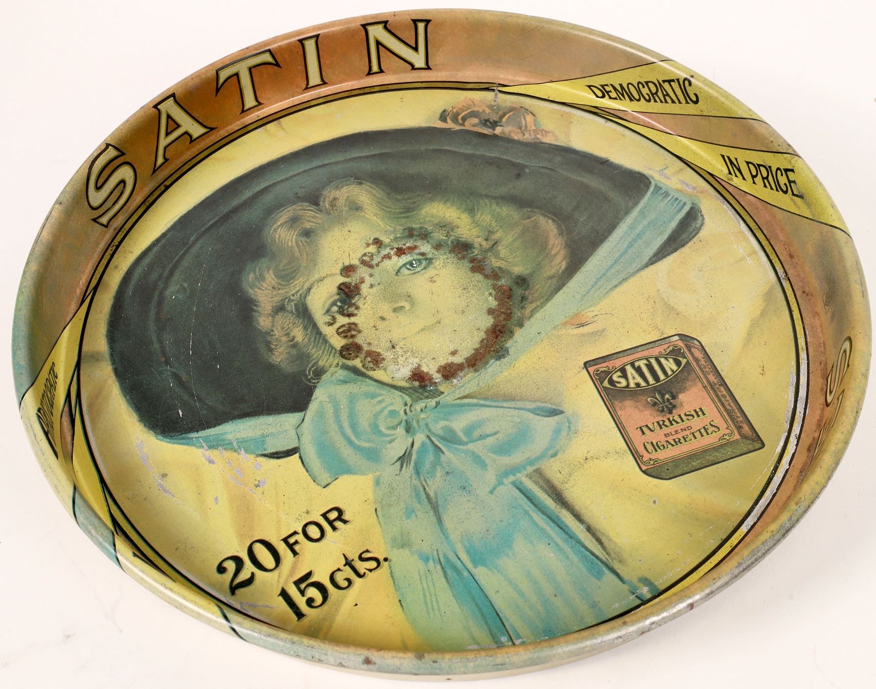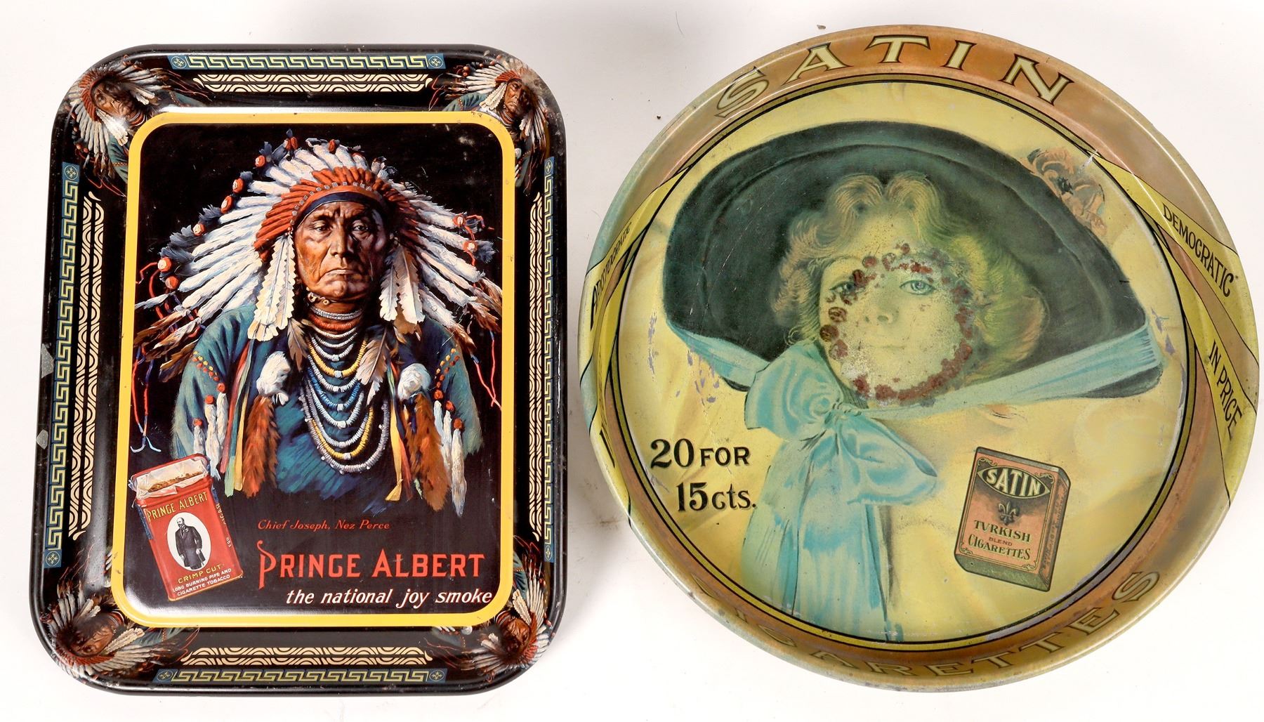 2 different tobacco themed drink trays. Rectangular Prince Albert, 13x0.5", nice condition! Round Satin Cigarettes, 14"-some rust and dent, please inspect.