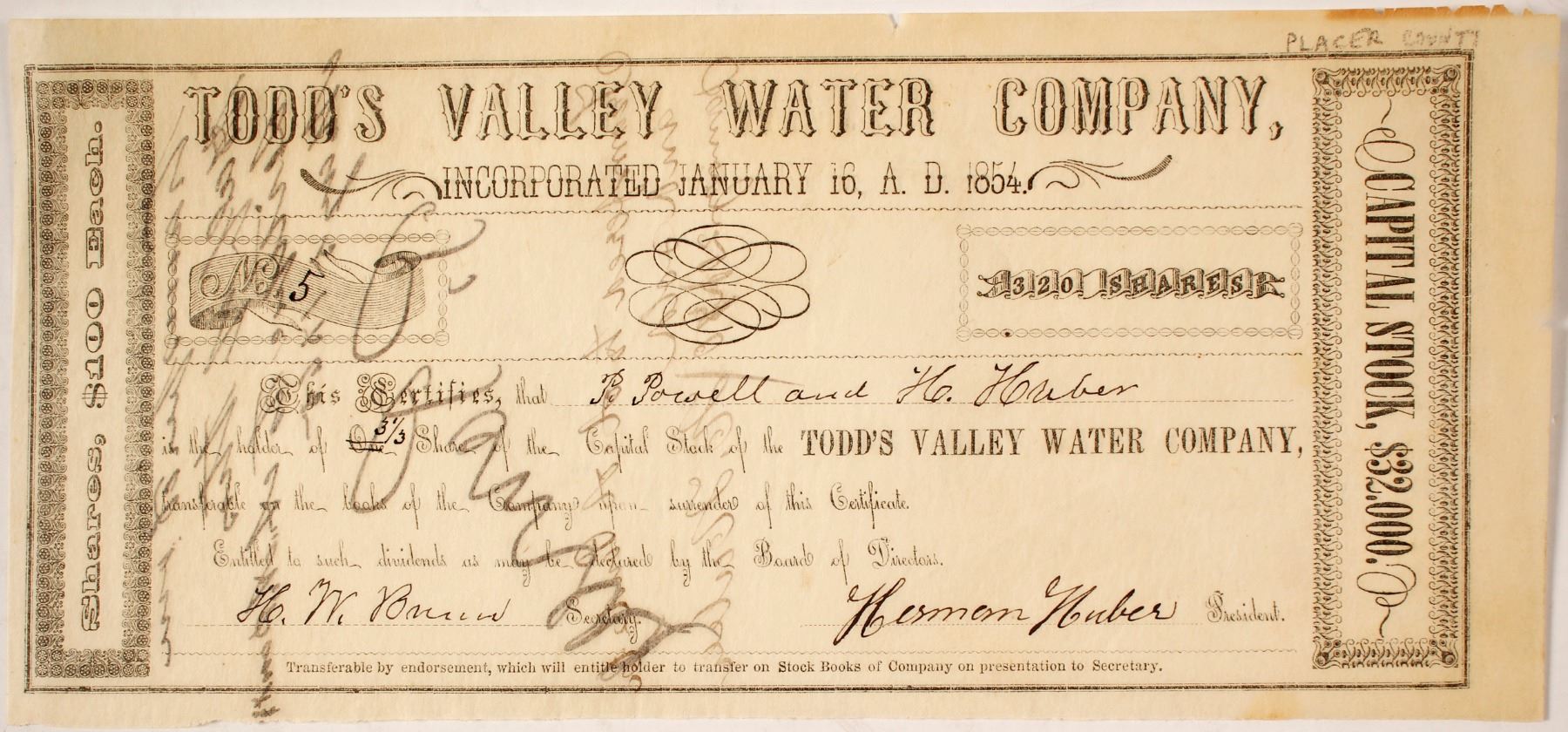 # 5! For 3 1/3 shares of the 320 shares available. To P Powell and Huber. Signed by HW Brown and president Huber. Located in Placer County. Reverse shows transfer of stock in 1865. Uncancelled, Small tears top and bottom edge. Very nice. Came with this history, Todd's Valley was first settled by Dr. Todd, who built a log house for a store and hotel, on the site of his present residence, at his ranch in the lower suburbs of the town, in June, 1849. The location at that time was the most eligible one to be found north of the Middle Fork of the American River, and was the proper distance from the river to catch all the travel from the old diggings in EI Dorado county to the new placers at Stony Bar ,Horseshoe Bar and Rester's Bar. We found a reference to Todds Valley Ditch Company which built more than 12 miles of works with a 400 inch capacity operating between 1856 and 1859. The town of Todd's Valley was nearly destroyed by a fire in 1859 and eventually lost out much of its population to Yankee's Fork, the nearest town. Apparently the company stayed alive for some ten years, at least. Ken Prag Collection