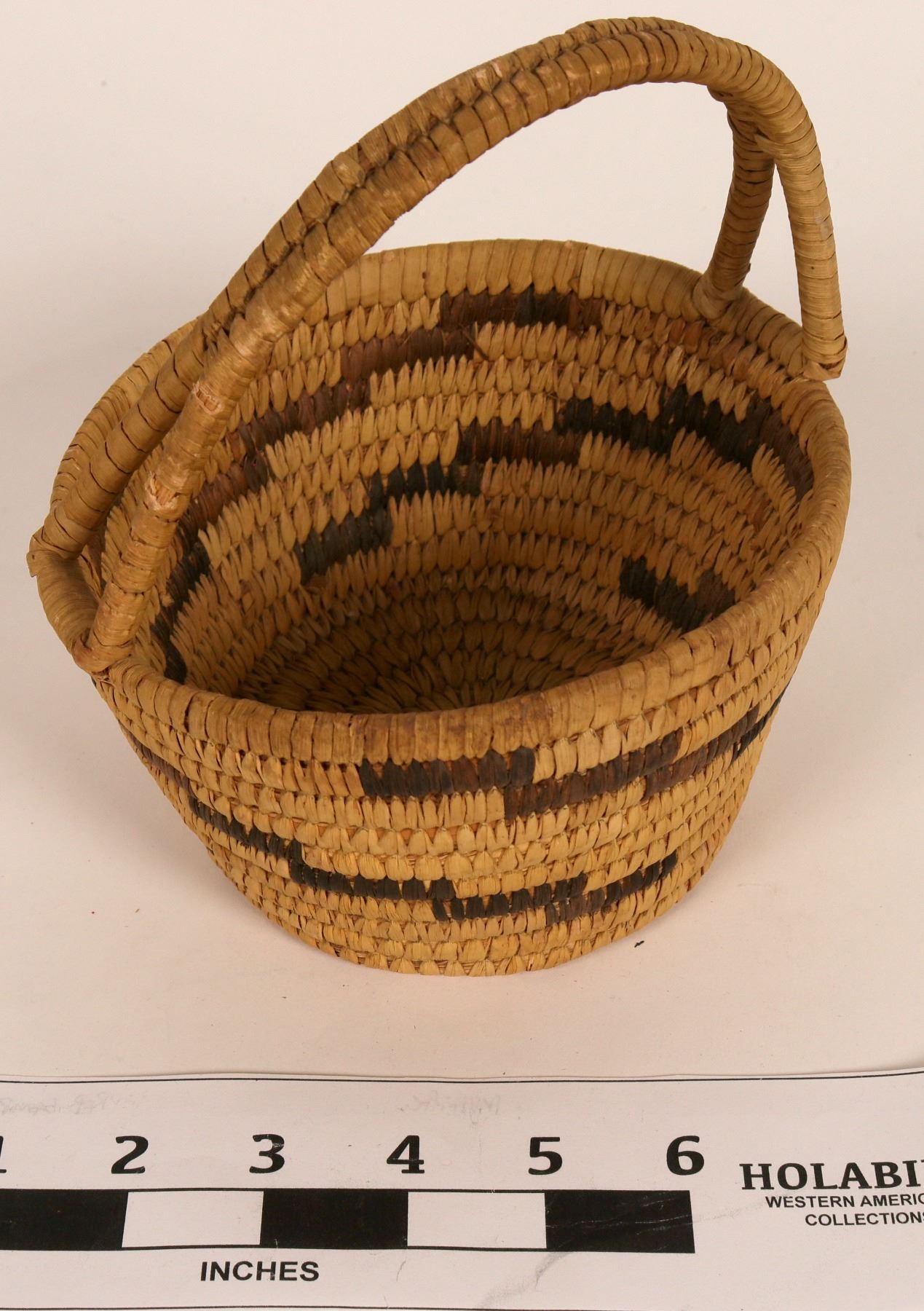Small Tohono O'dham basket with handle. 6" diameter x 7" high. Zig zag design. Materials used are yucca, bear grass and black Devil’s Claw. Very good condition.