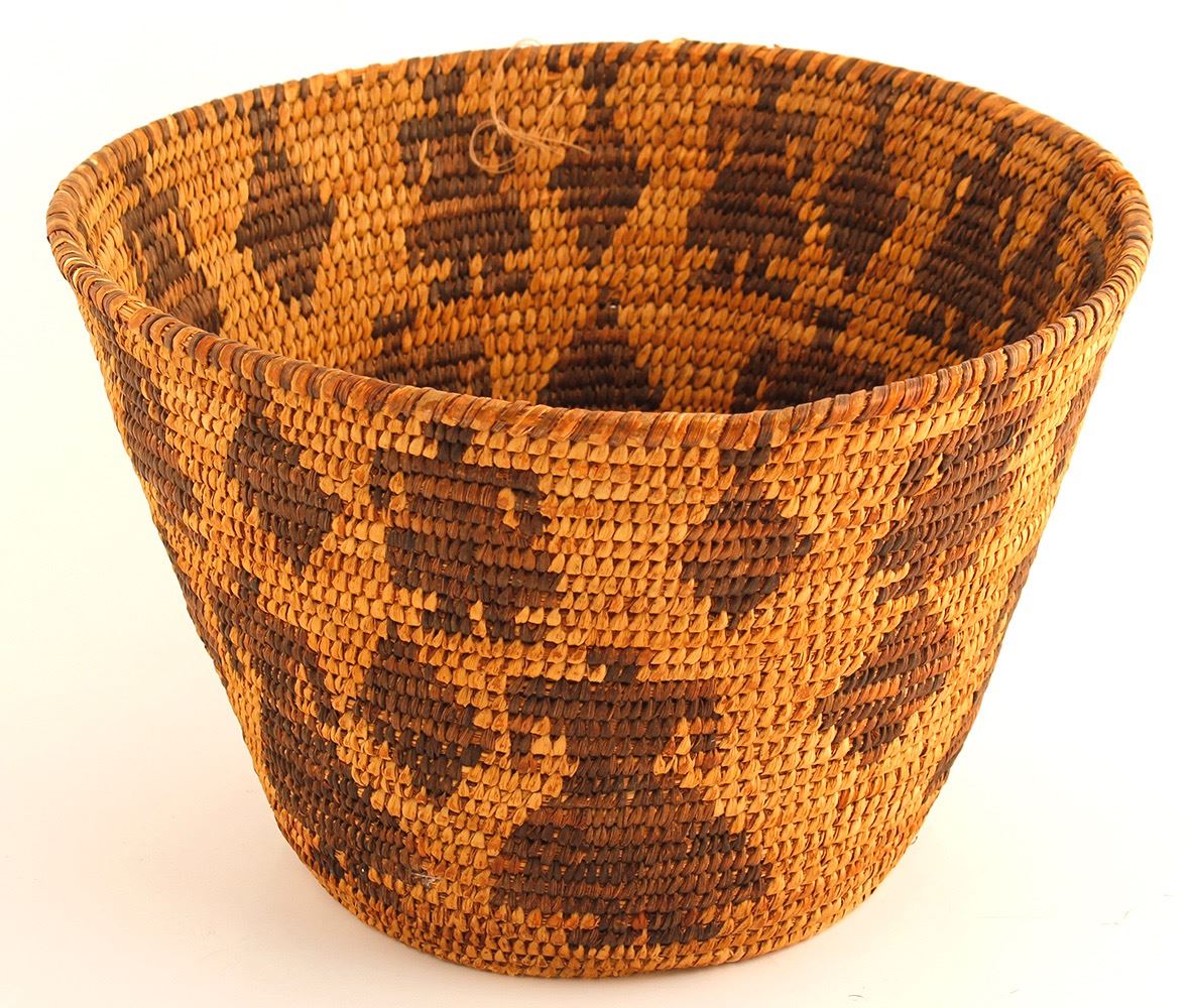 Early 20th century Tohono O'odham pictorial basket. female figures and diamond shapes. 7.25" h x 11.25" diameter. Very good condition, a few small areas of missing wrap on rim. Date: c.early 20th century Location: Arizona HWAC # 52146