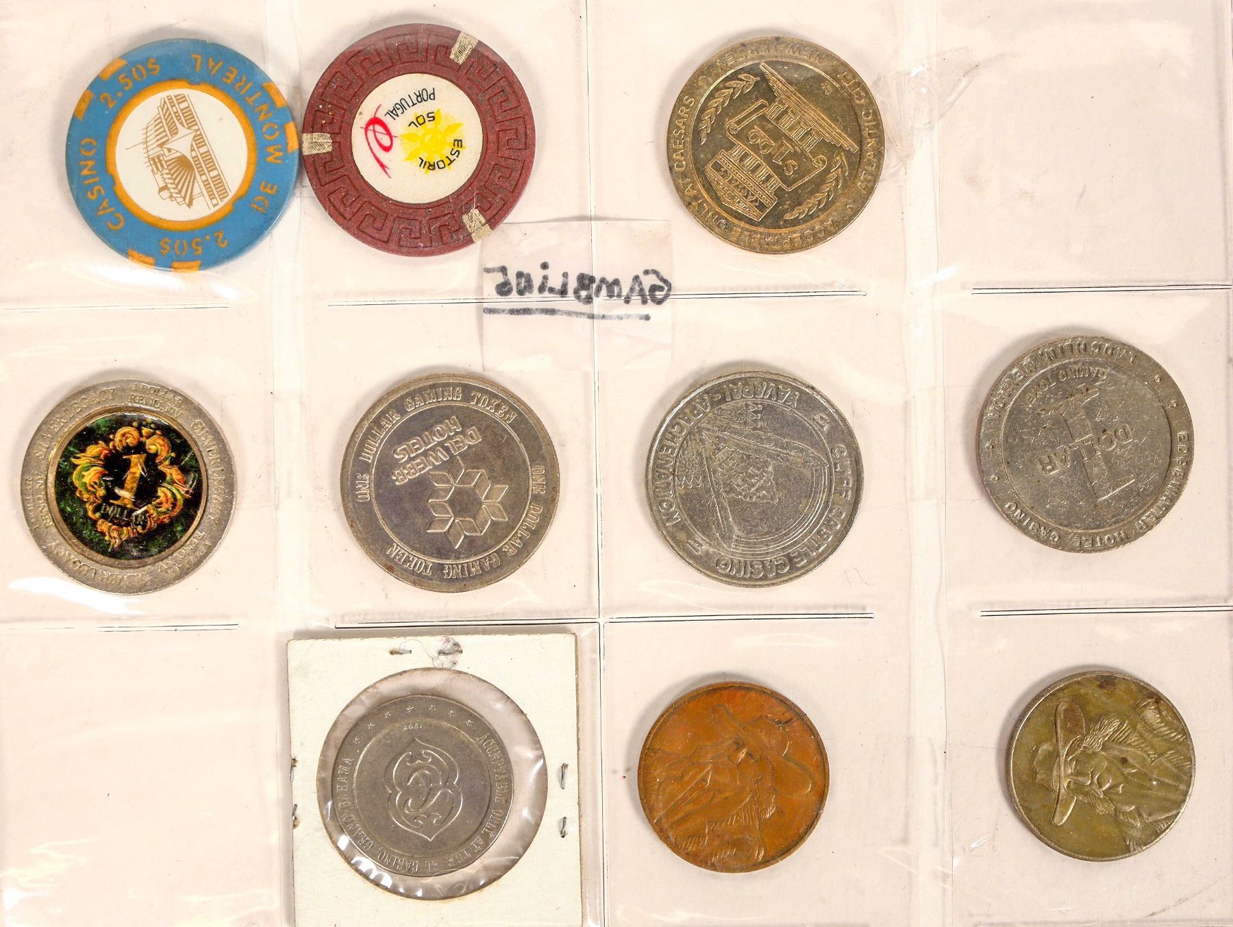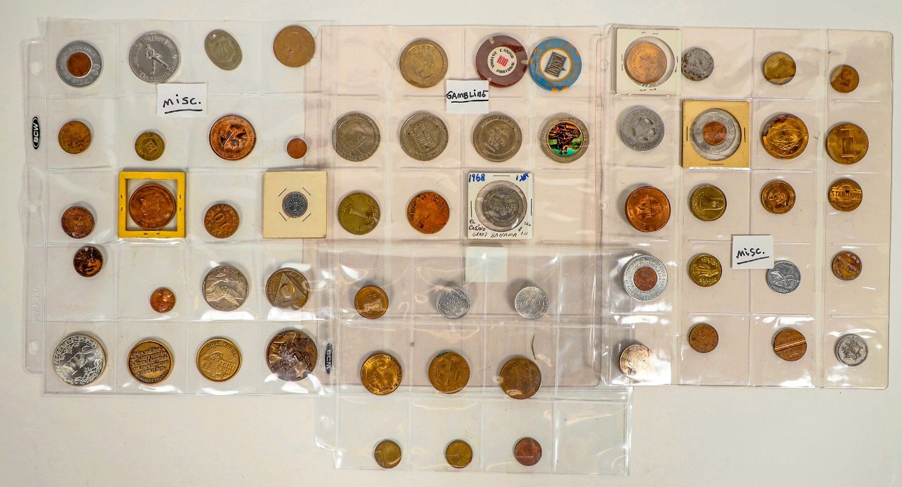 About 59 assorted tokens and a few casino chips. Sahara Reno, encased pennies, Cove Forge, Sears, Sunoco, Westinghouse, General Motors etc. See photo.