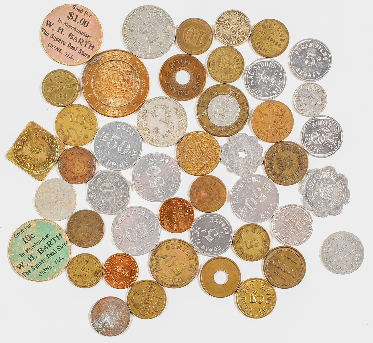 Lot of 45 tokens of all kinds. Mostly "good fors". One bimetallic, aluminum, brass, copper, cardboard. San Francisco, Chicago, Cisne, Ill., Oakdale, CA; Rolapp, Utah. A fun assortment. Date: Location: HWAC# 75162