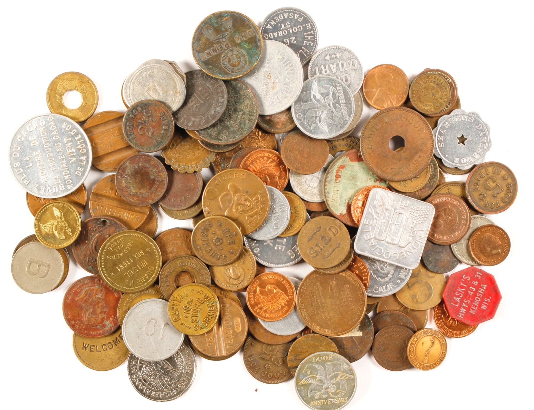 Lot of 105 tokens. 1915 SF Pan Pacific Expo, Knott's Berry Farm, some Coca Cola tokens in Spanish. State: City: Date: HWAC# 84743