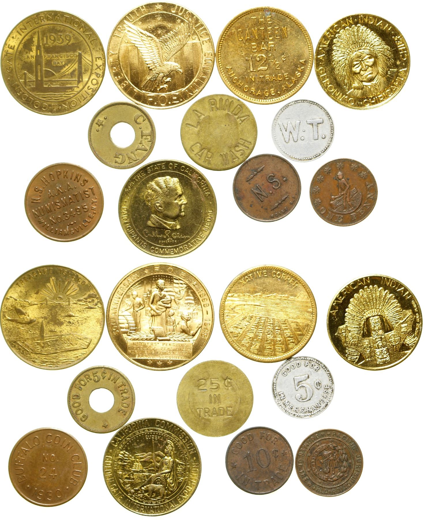 Lot of eleven tokens with nothing in common. Golden Gate Expo, 1939; The Cantine, Anchorage; La Rinda Car Wash; 1930 ANA token; Woodmen of the World; several mavericks. Salvatore Falcone Collection.