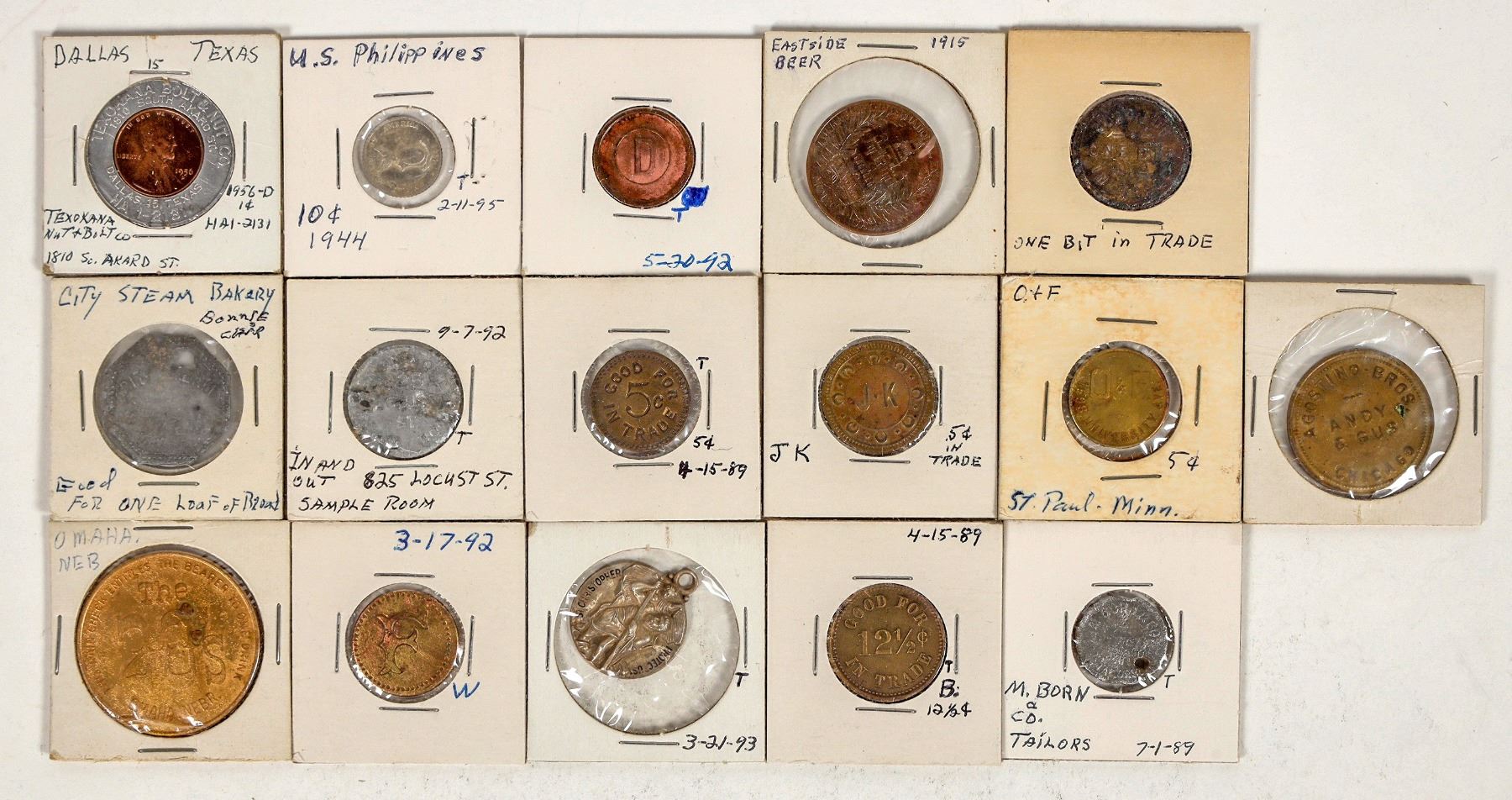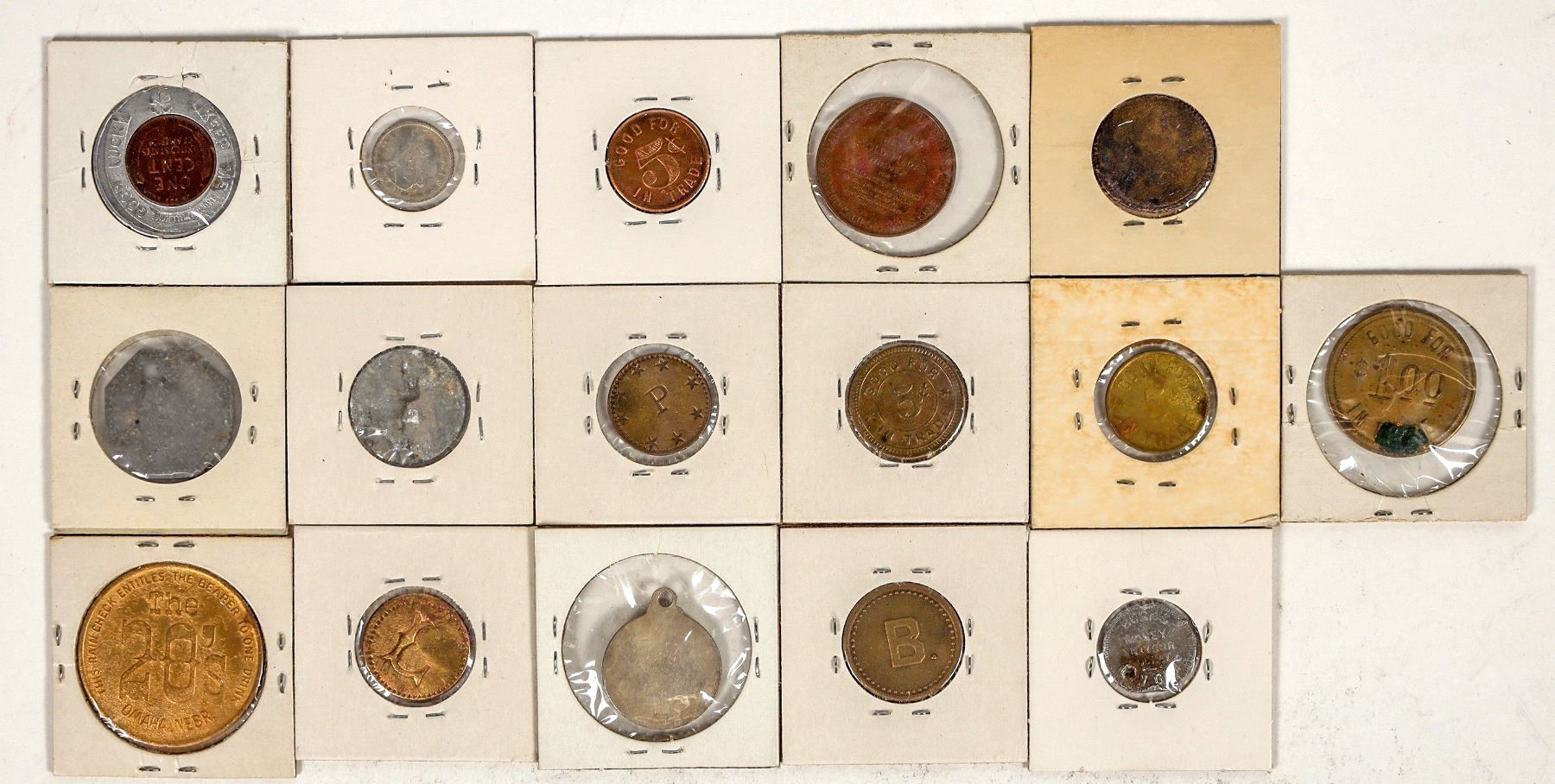 Grab bag of 17 mixed tokens and medals to keep a ravenous collector well entertained. Includes an interesting US/Philippines 10 centavos piece from 1944; a period of time during which the US annexed and colonized part of the Philippines. The majority of these coins are in good condition with legible text and appealing finish, with 4 having severe rust which has resulted in holes or otherwise notable defects. See photo.