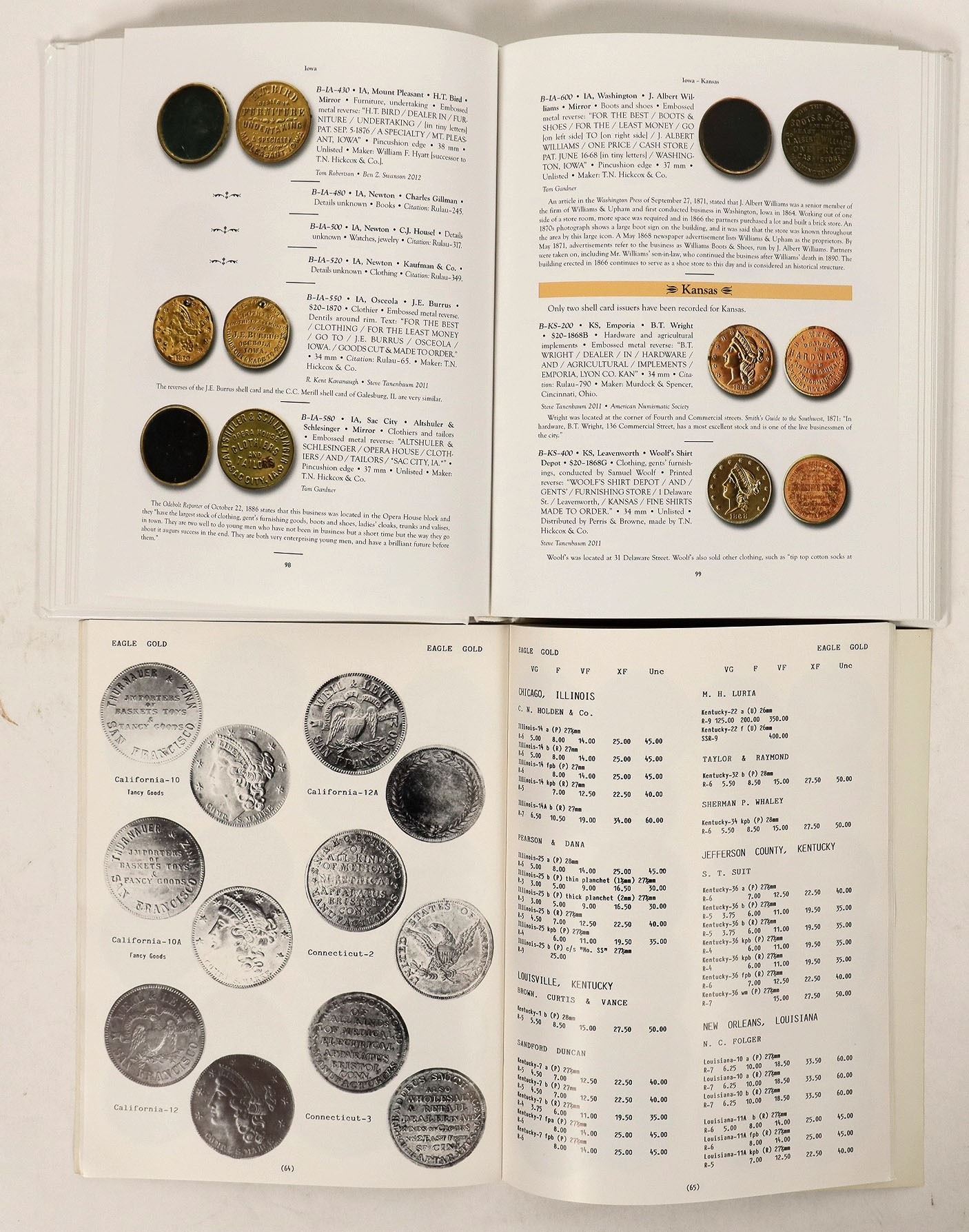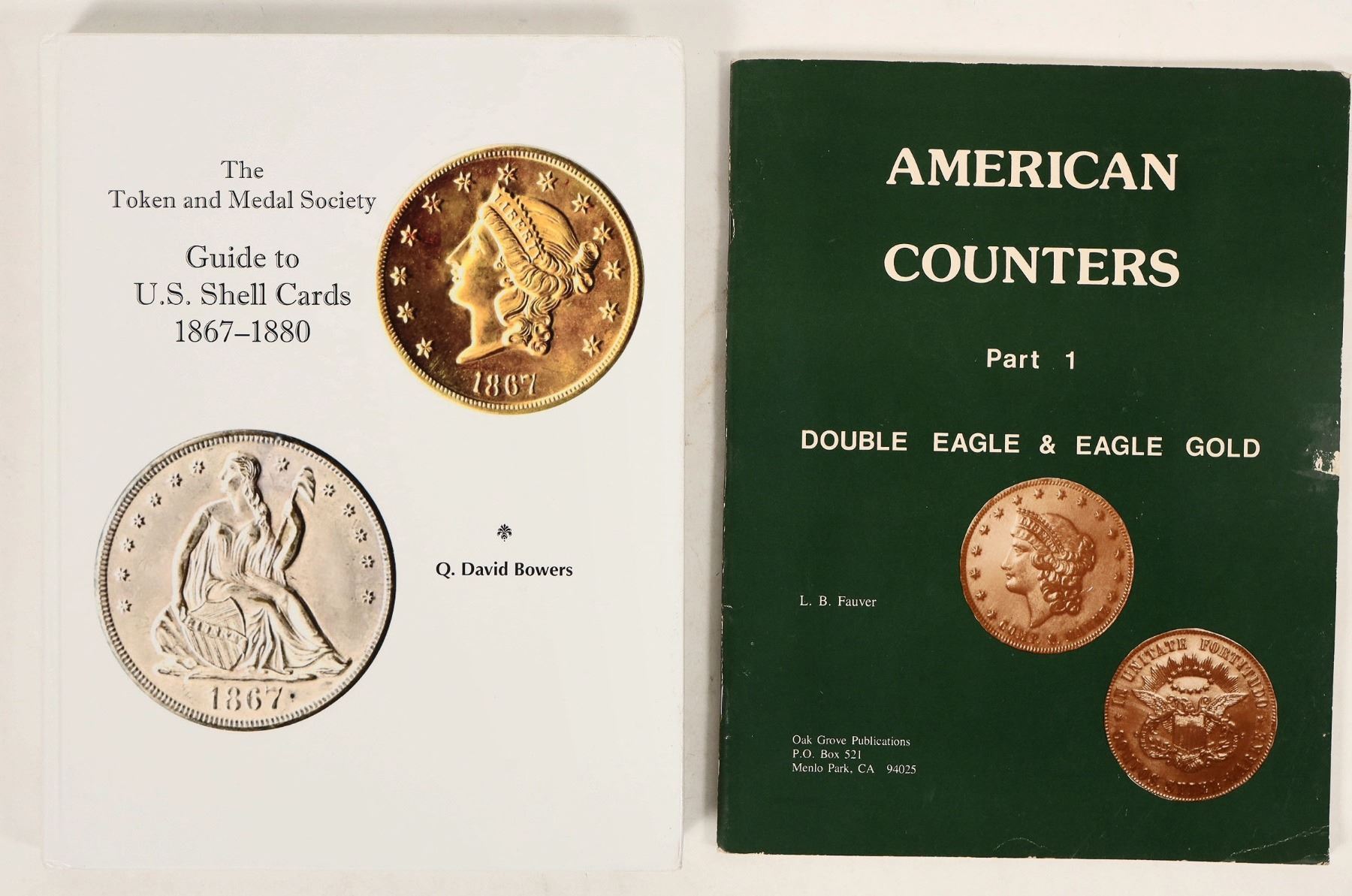 American Counters Part 1, double eagle & eagle gold by Fauver, 1983, 100pp with index. The TAMS Guide to U S shell cards, 1867-1880 by Bowers, 2014, 356pp.