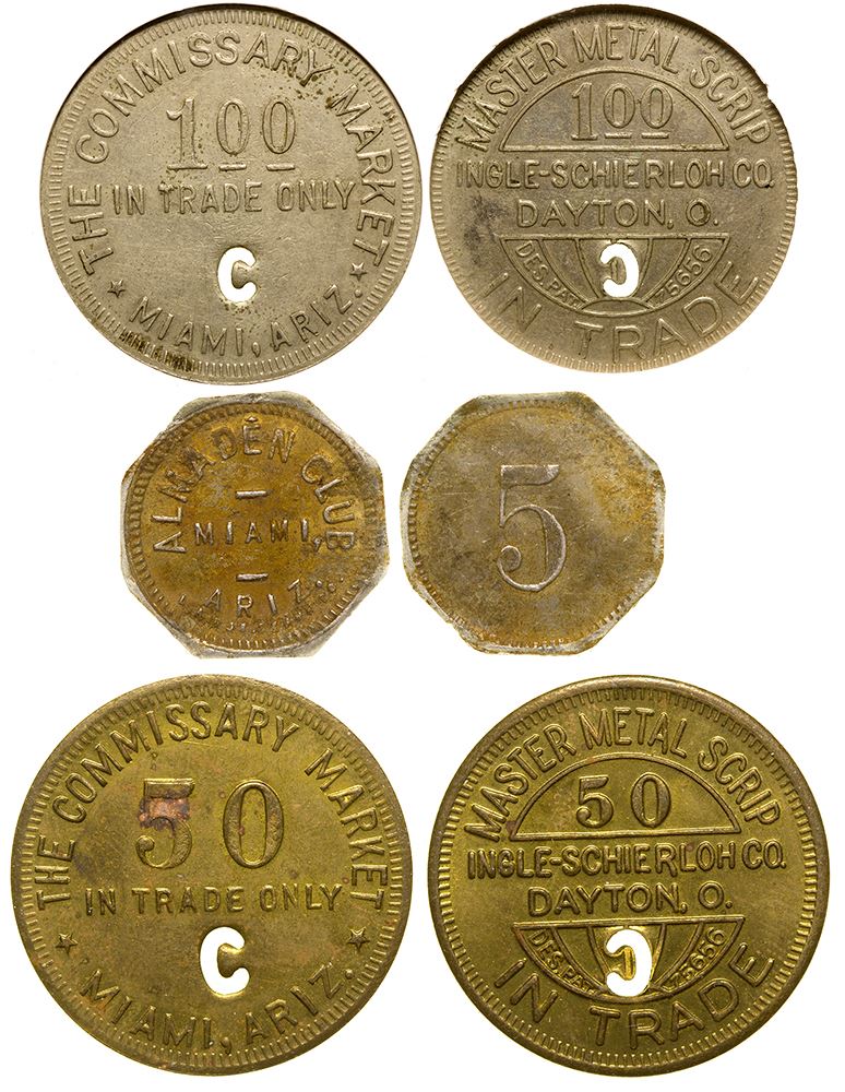 Lot of 3: 1) Obv.: Commissary Market / 1.00 / In Trade Only / Miami, Ariz.; rev.:Master Metal Scrip / 1.00/ Ingle-Schierloh Co. / Dayton, O. / In Trade; "C" cutout; NGC AU58; 2) Obv.: Almaden Club/ Miami / Ariz.; rev.: 5; NCS genuine; 3) Obv.: The Commissary Market / 50 / In Trade Only / Miami, Ariz.; rev.: Master Metal Scrip / 50 / Ingle-Schiercom co. / Dayton O. / In Trade; "C" cutout.