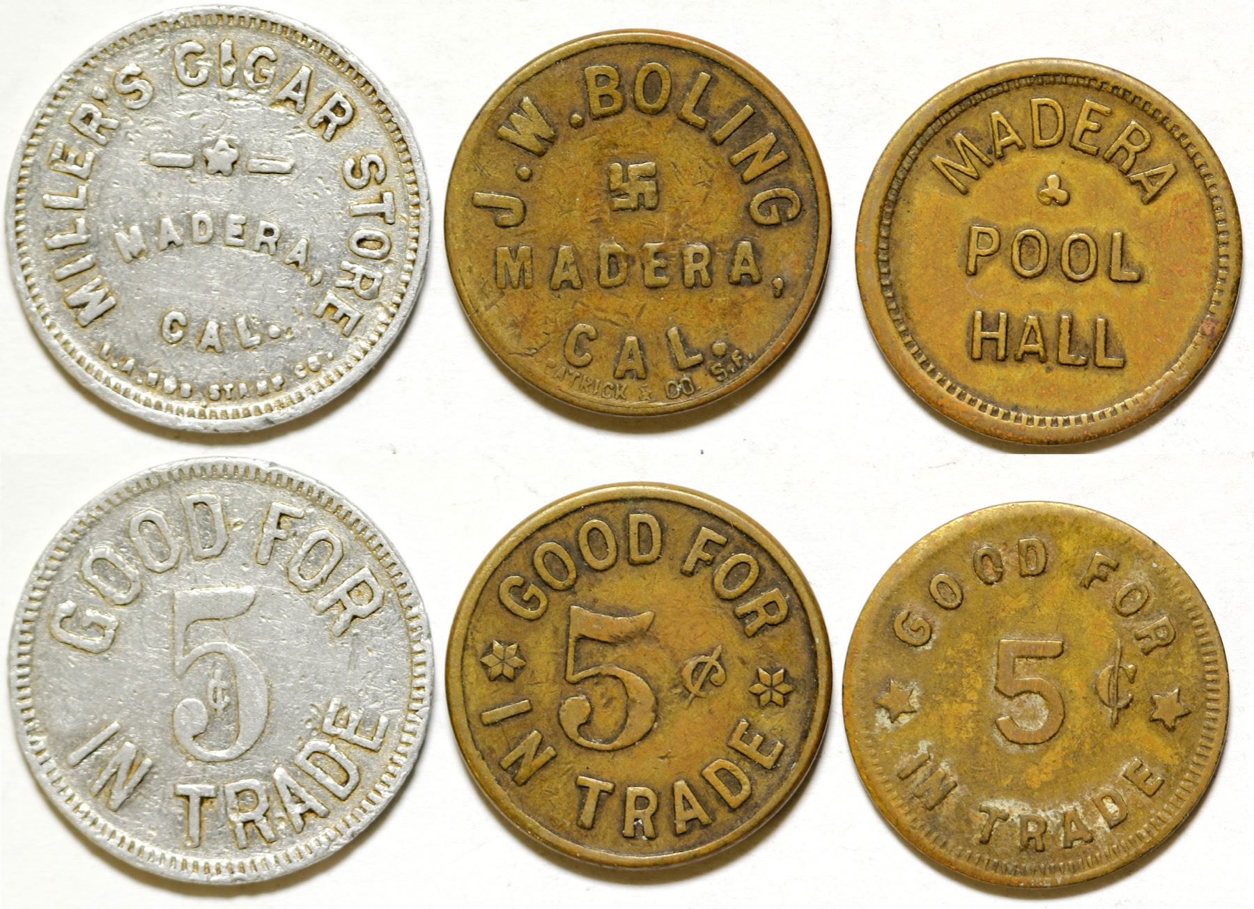 Lot of three: Madera Pool Hall, GF 5c; Williams Cigar Store, GF 5c; J. W. Boling, GF 5c.All possibly unique, listed as one known. Daniel Manassillian Collection. State: California City: Madera Date: HWAC# 84349