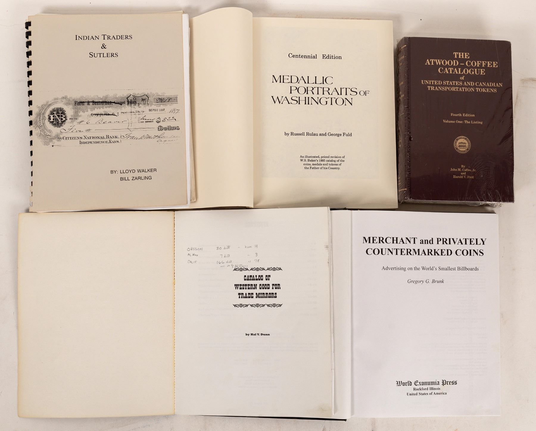 Atwood Coffee Catalogue of US and Canadian Transportation Tokens Vol. 1, Medallic Portraits of Washington by Rulau, Catalog of Western Good For Mirrors by Dunn, Indian Traders & Sutlers by Walker, Merchant and Privately Countermarked Coins by Brunk.