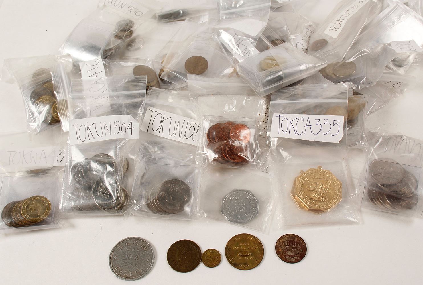 Grab bag of tokens from the 1984 Olympic Games Transportation token, brass token, $50 Gold Slug Replica; Amusement Games of Texas; & so much more. HWAC# 57561 Date: Location: United States