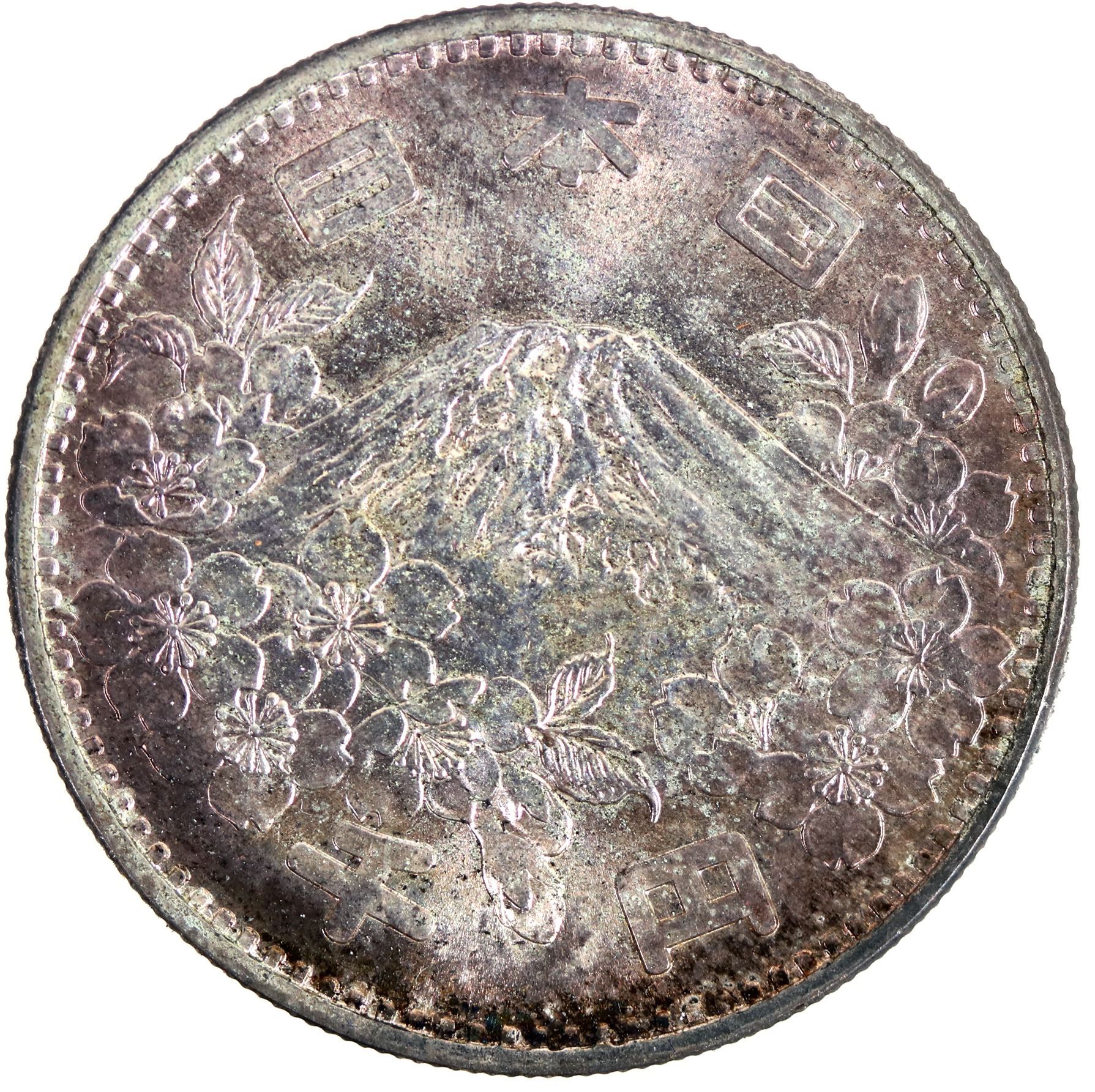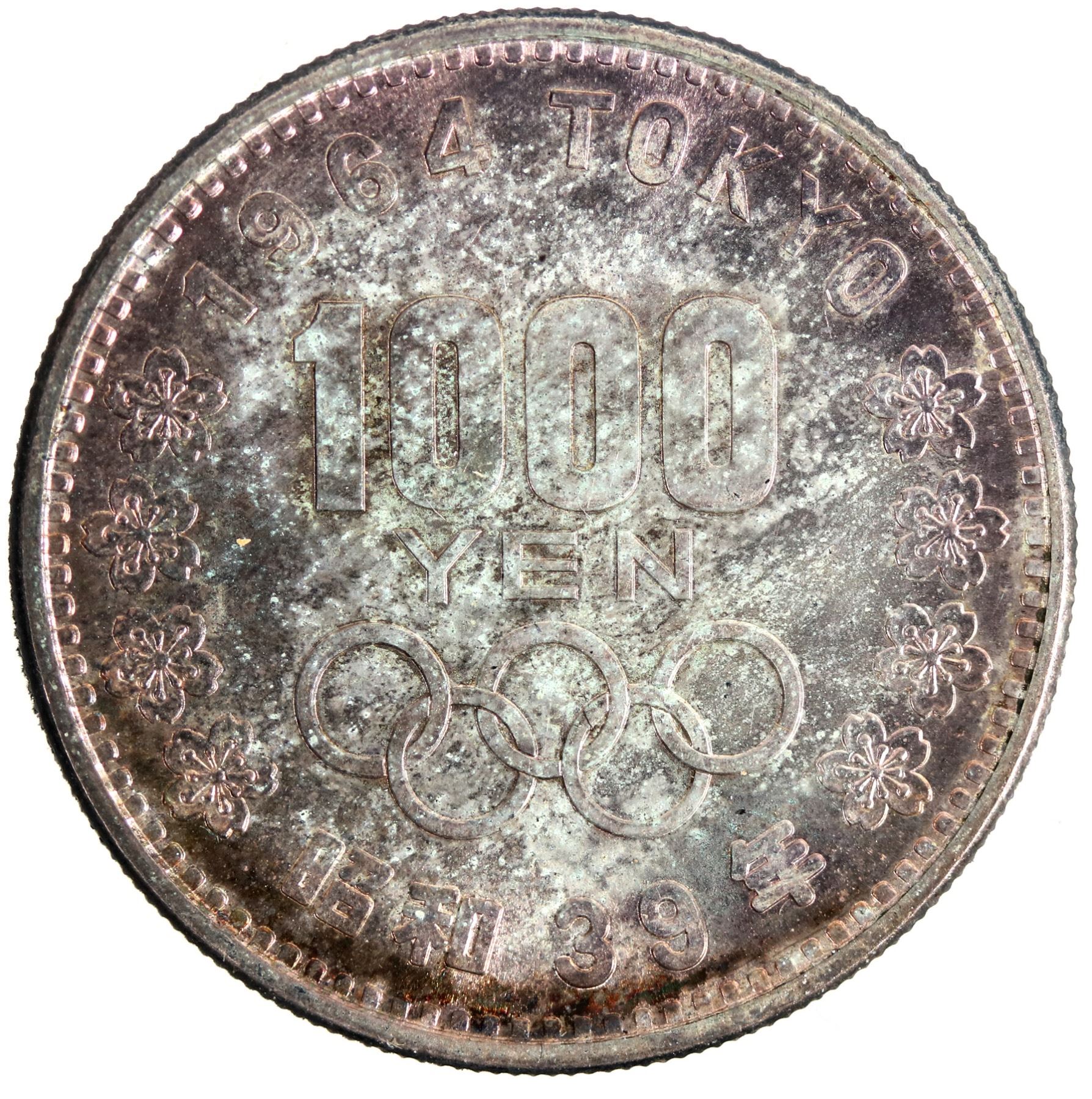 Nicely toned, uncirculated commemorative issue 1964 Summer Olympics, Tokyo. Obverse: Mt. Fuji with cherry blossoms. Lettering: 日本国 // 千円; Translation: State of Japan // 1000 yen. Reverse: Big denomination and Olympic rings in the middle surrounded by text separated by cherry blossoms; Lettering: 1964 TOKYO // 1000 // YEN // 昭和39年 (Translation: Year 39 of Shōwa). Silver (.925); 20 grams; 35 mm; 2.50 mm thick.