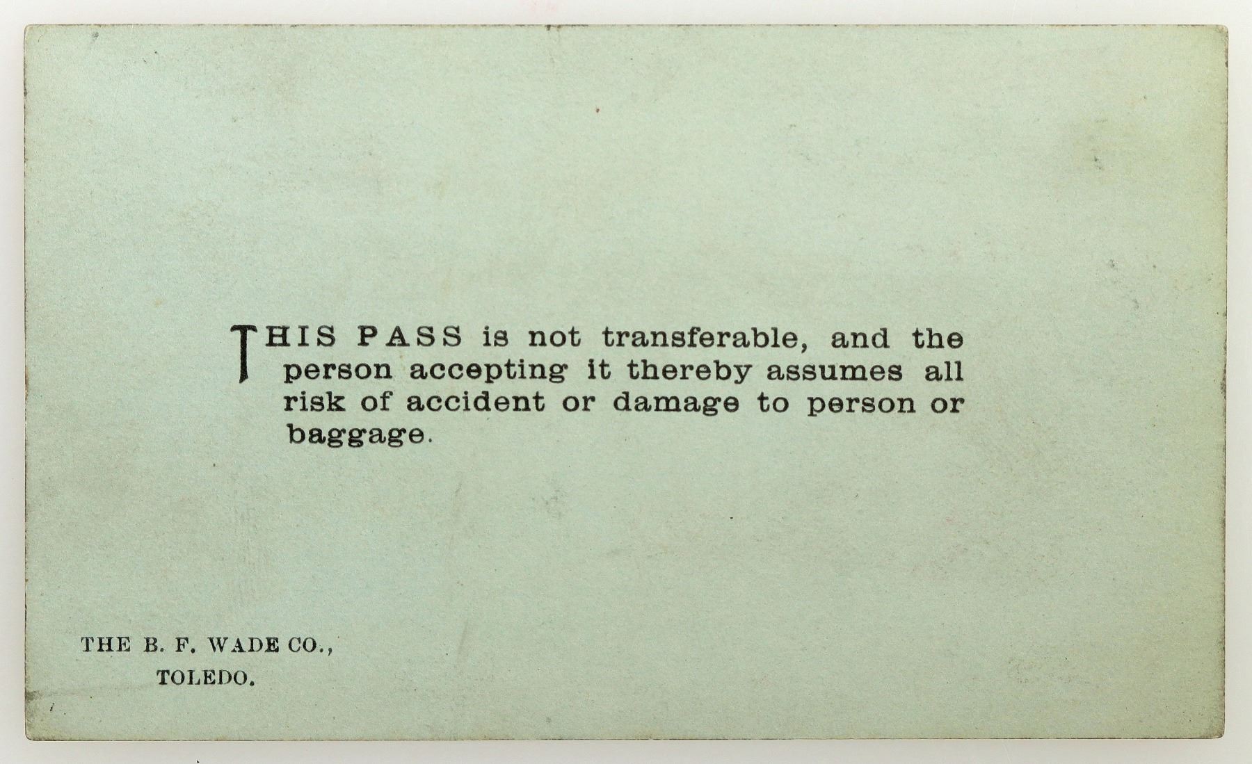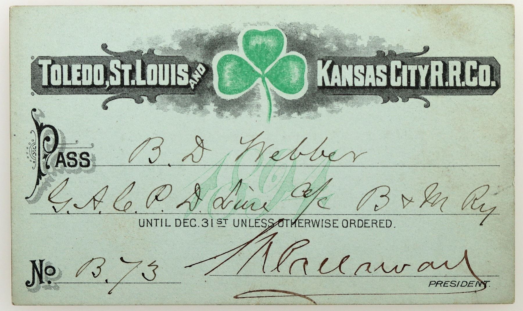 Pass B73, issued for 1894 to BD Webber. Signed by president Callaway. Black print on blue cardstock with green four-leaf clover vignette incorporated into the title. Composed of 3 companies: Toledo, Dupont and Western Railway of Ohio; Bluffton, Kokomo and Southwestern Railroad of Indiana; and Toledo, Charleston and St. Louis Railroad of Illinois. Reorganized in 1900 and renamed as the Toledo, St. Louis and Western Railroad.