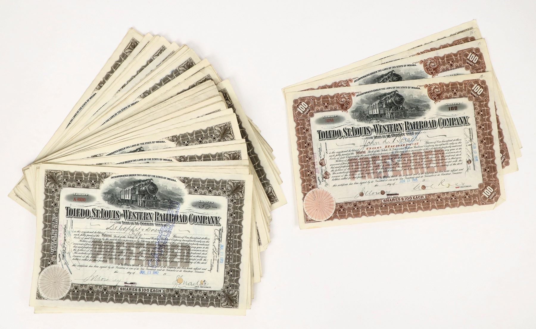 Toledo, St. Louis and Western Railroad Company stock certificates. c1910 Preferred stock in dark brown and burgundy, common stock in orange. ~75 pcs., 11.25 x 7.5 in. President, W.L. Ross; Vice President, J.F. Mackie; Secretary, J. Maroney.