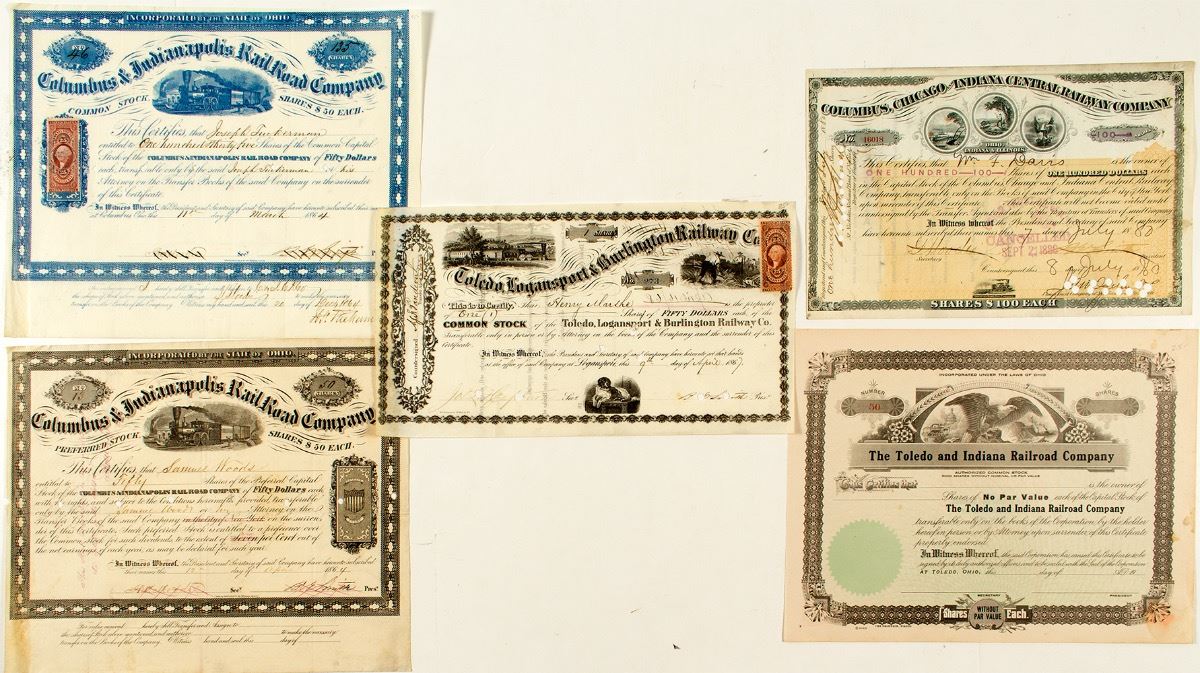 Lot of 5 different.1) Two different stocks (blue and black) for Columbus & Indianapolis Railroad Company (both issued in 1864). Both are pen and punch cancelled and feature the same locomotive vignette. One has a 25c adhesive revenue still attached. 2) An 1867 issued stock for Toledo, Logansport & Burlington Railway Co.. Punch cancelled. Three vignettes. 25c adhesive revenue stamp upper right. 3) 1880 issued stock for Columbus, Chicago and Indiana Central Railway Company. Punch and pen cancelled. Three small allegorical vignettes. 4) Unissued (19--) stock for The Toledo and Indiana Railroad Company. Eagle vignette. Some stains. (Prag Collection) City: State: Ohio Date: 1864-1900s hwac# 33978