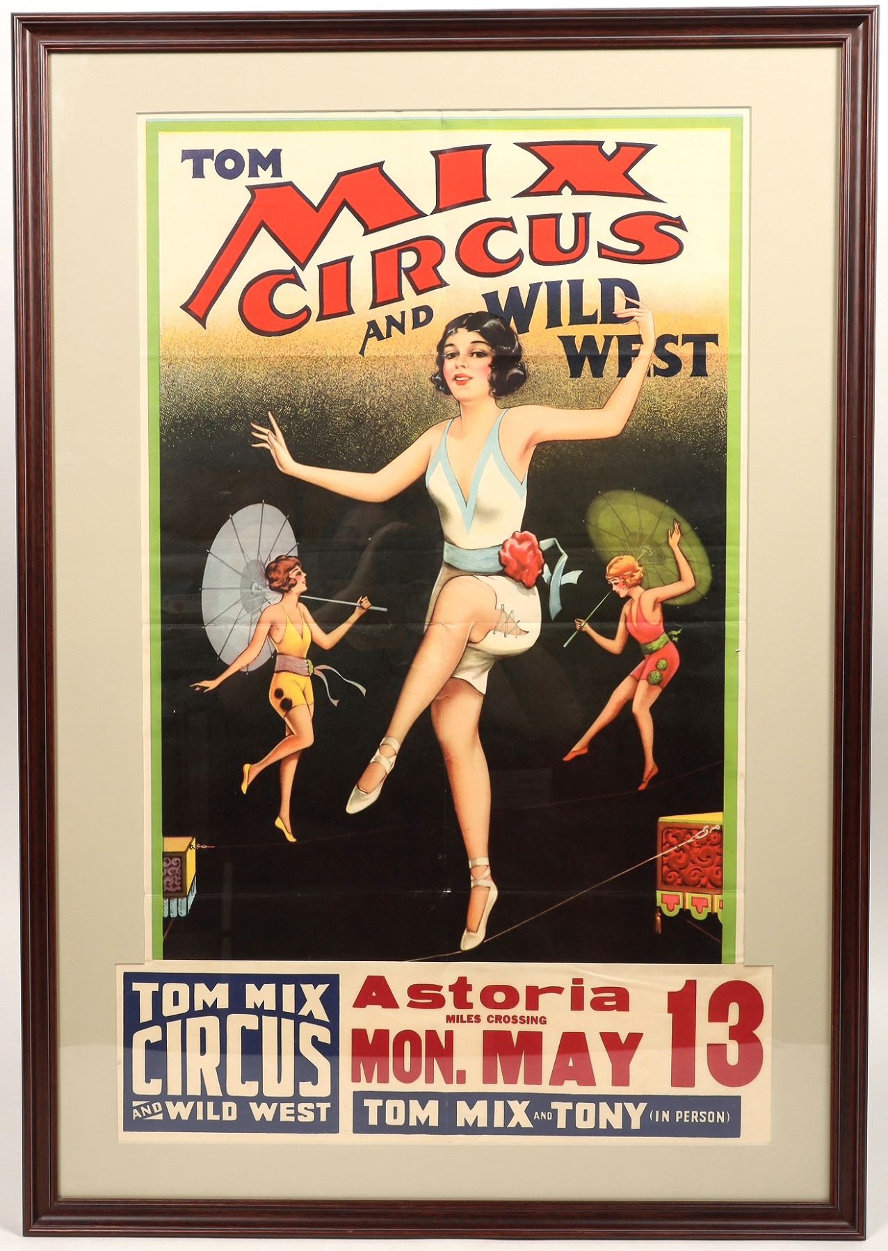 Tom Mix Circus and Wild West Show Original Framed Broadside c1935-38 for show in Astoria at Mills Crossing on May 13th. Tom Mix was a Hollywood star and cowboy who made more than 165 cowboy films. He worked at the famous Miller Brothers 101 Ranch and throughout his career he performed in many of the most famous Wild West Shows in the country. This original, framed broadside is for his own circus and Wild West show, which operated from 1935-1938. Mix toured the Country with Tony The Wonder Horse until his circus folded in 1938. Mix died in an unfortunate automobile accident in 1940. Incredible, rare poster with slight creasing from being folded at one time barely visible under plexiglass. 31.5 x 18.5 inches visible under matte. Overall size, including frame is 26 x 37.5 inches. Professionally framed and matted, sealed reverse. Very Rare.