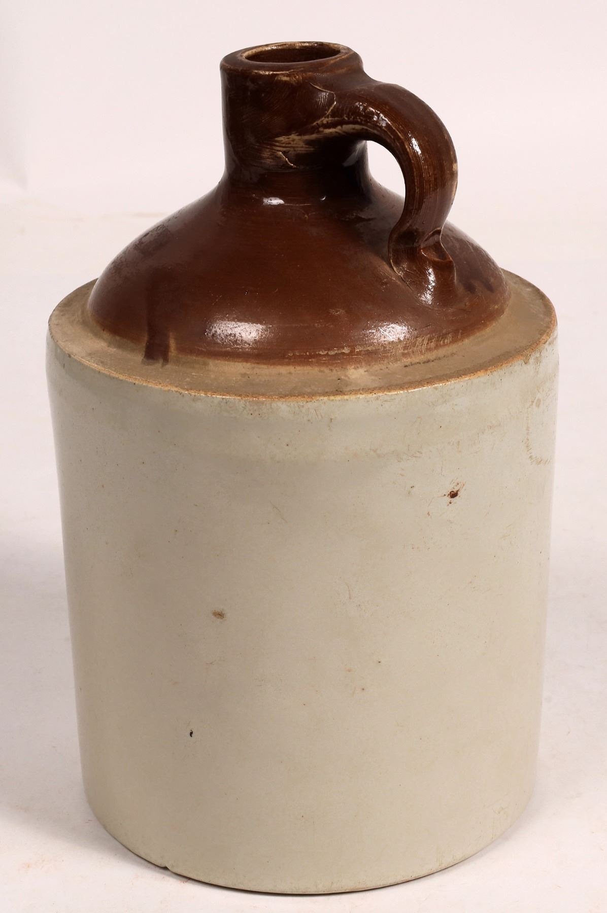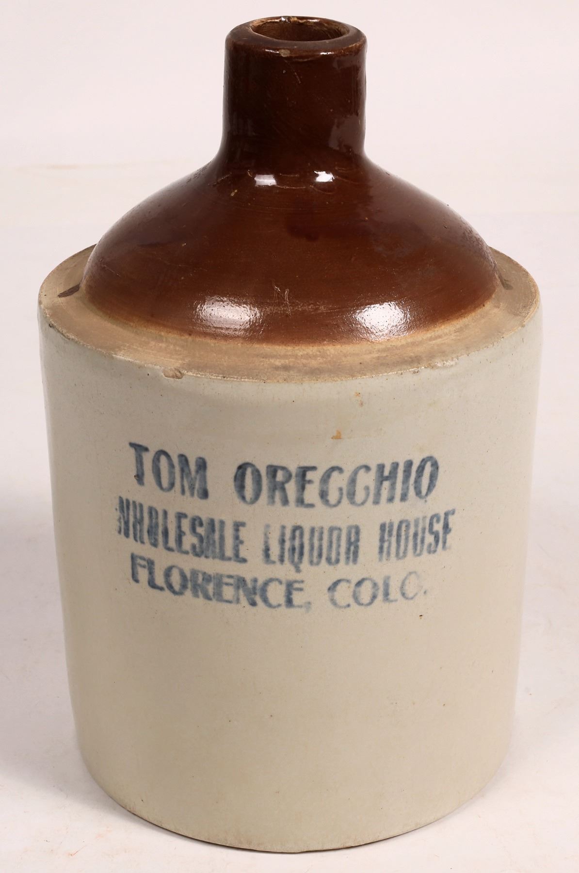 J147 in Preble. 2 tone jug. Tom Orecchio/Wholesale Liquor House/Florence, Colo. 9x5.5". .25" shoulder chip, no other apparent chips or cracks.
