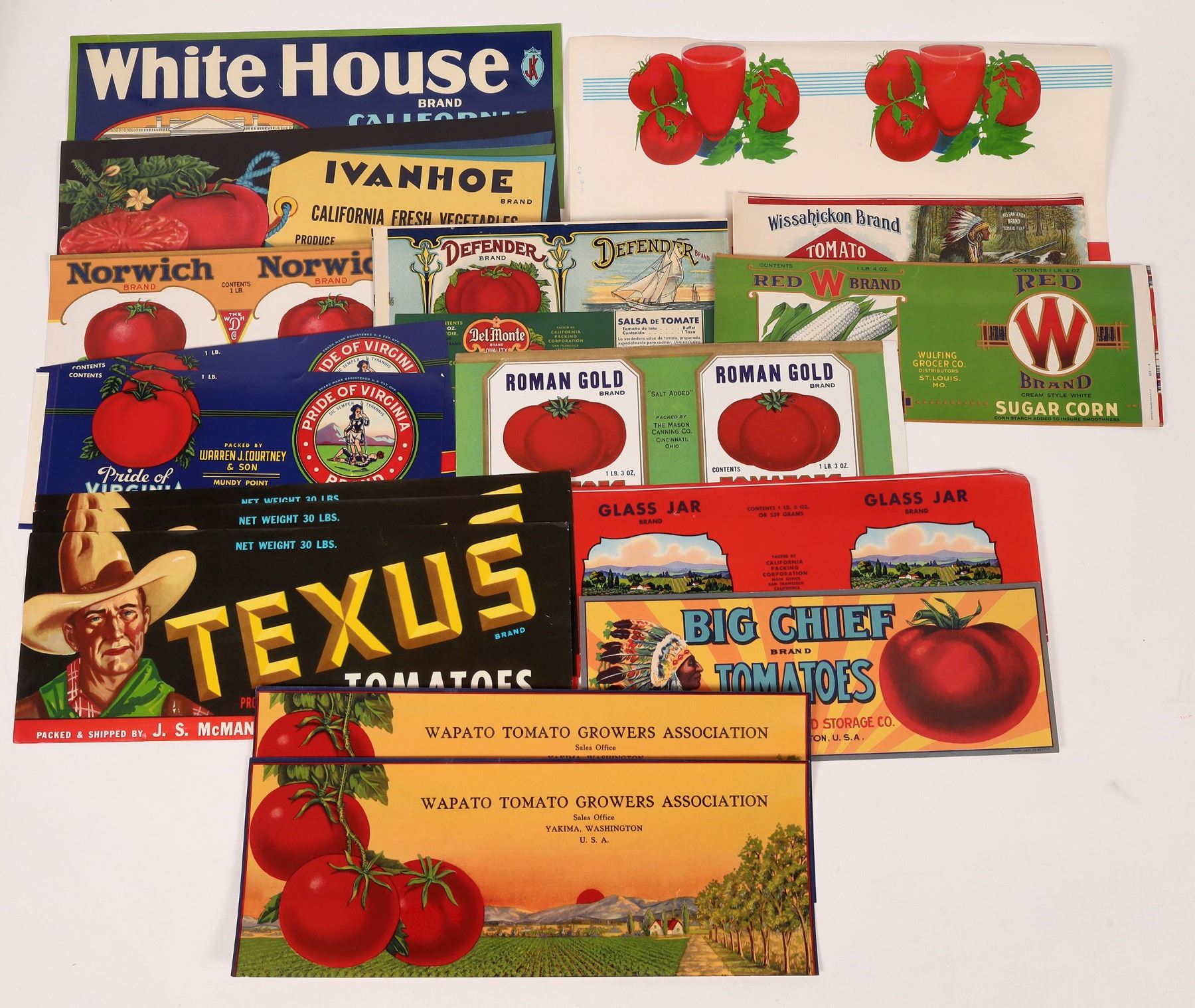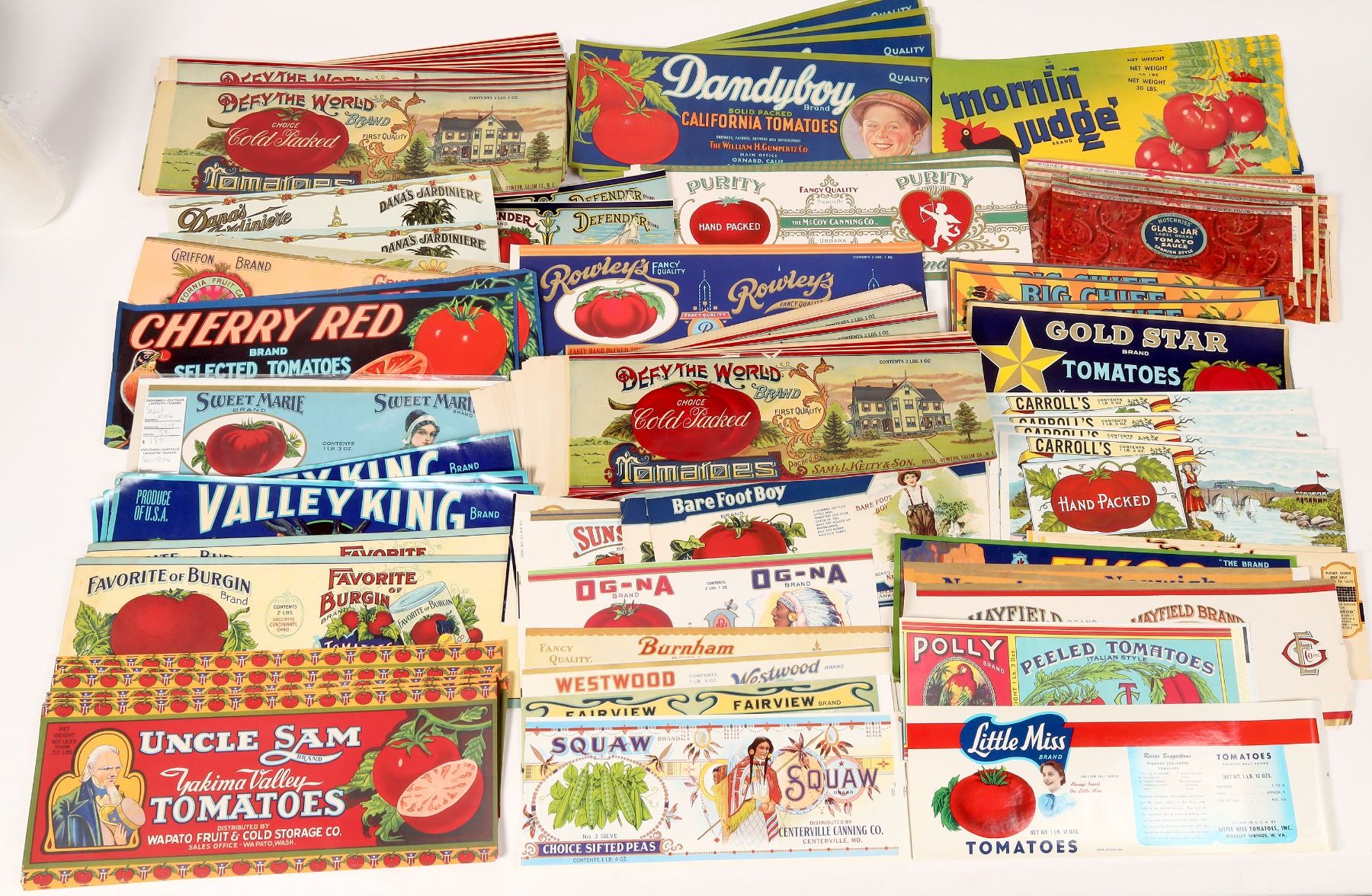 About 400 tomato can labels in various sizes. Defy The World, Dandy Boy, 'Mornin Judge", Valley King and more.