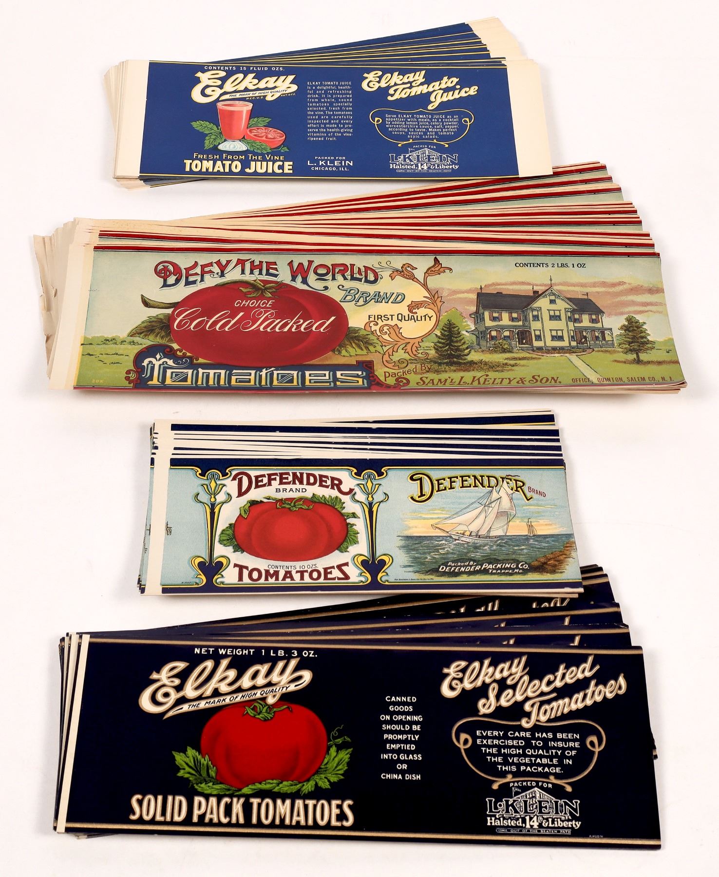 About 400 tomato can labels 3.75x9"-4.5x14". Elkay Tomato Juice and Solid Pack, Defender, Defy The World.