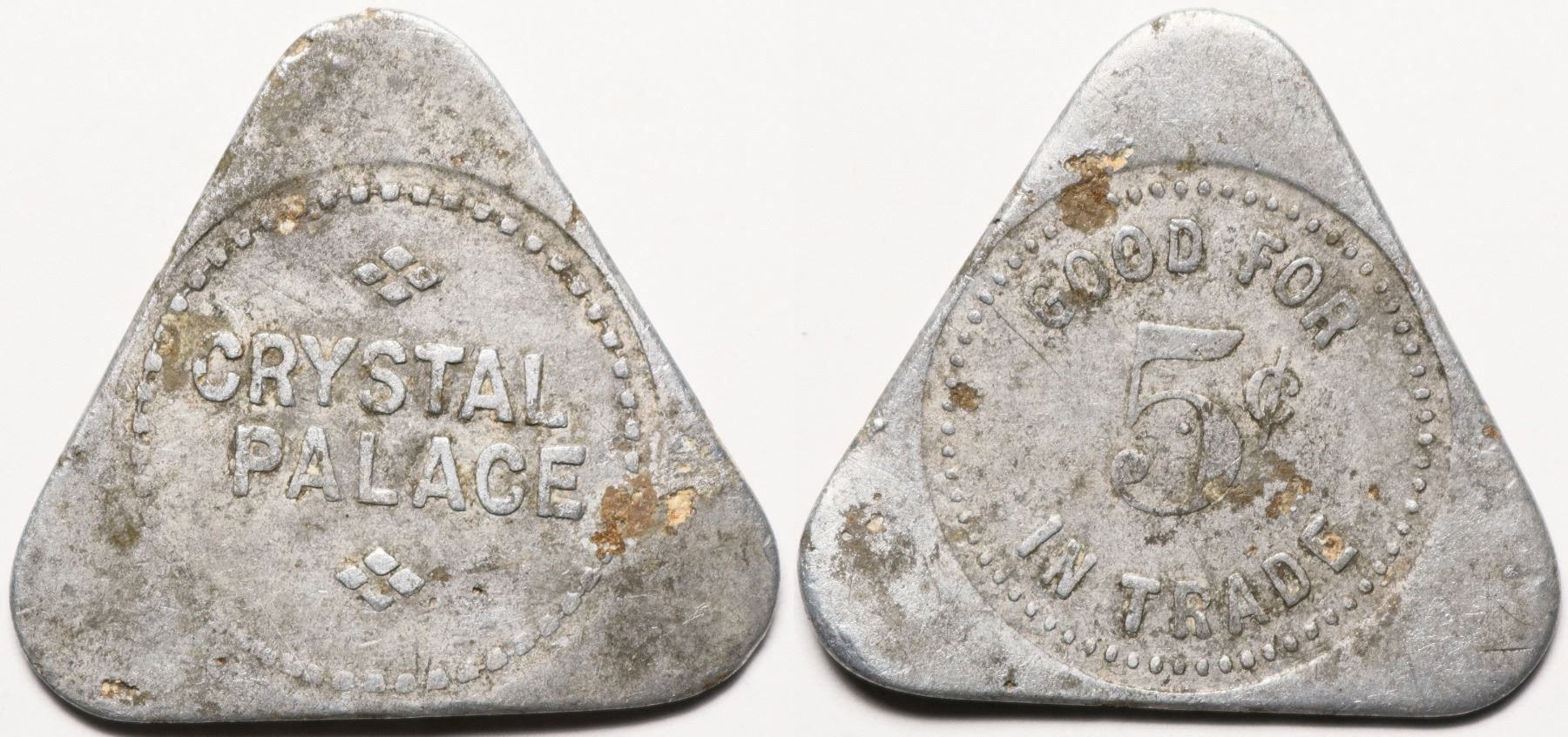 Crystal / Palace // Good for 5c / In Trade. Diamond shape, wm. The Crystal Palace Saloon was the most famous of all Tombstone Saloons, originally known as the Golden Eagle Brewing.