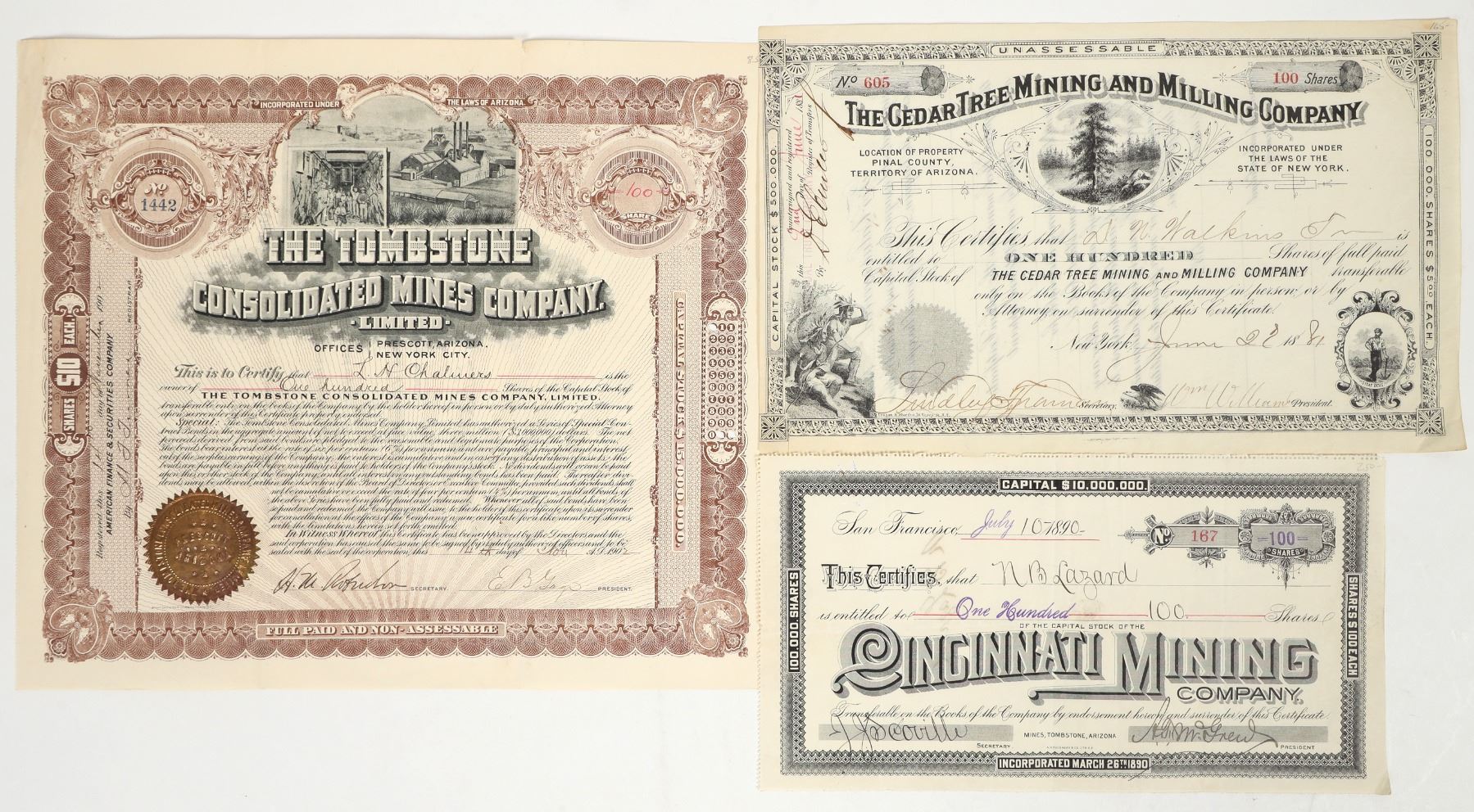 Lot of 3. I/U 1. The Cedar Tree Mining and Milling Co., issued 1881, three vignettes: Miner, Lone pine tree and Indians . Grogan and Murtha printer. EF cond. 2. The Tombstone Consolidated Mines Co. Limited, issued 1902, vignette of mine. and men in shaft, gold embossed seal. Brown, Lett and Pett printers. No damage, tri-fold. 3. Cincinnati Mining Co., issued 1890, no vignette, A.H. Wagaman and Co printers. no damage, tri-fold.