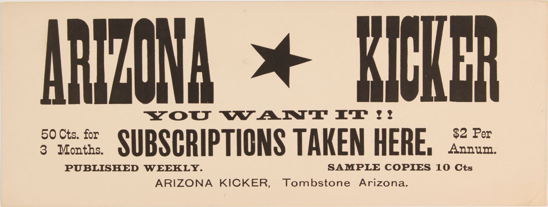 From an early printing co. proof book that contained samples of many print jobs from the 1890's. Actual age of this piece is unknown. A black on cream card for the "Arizona (star) Kicker...50 cts. for 3 months...Published weekly...Tombstone, Arizona". No mention of Territory. However, found with a small group of paper that was "A.T." marked. A quick search shows this newspaper in biz c.1890's. Mint. Date: Location: Tombstone, Arizona HWAC # 53635