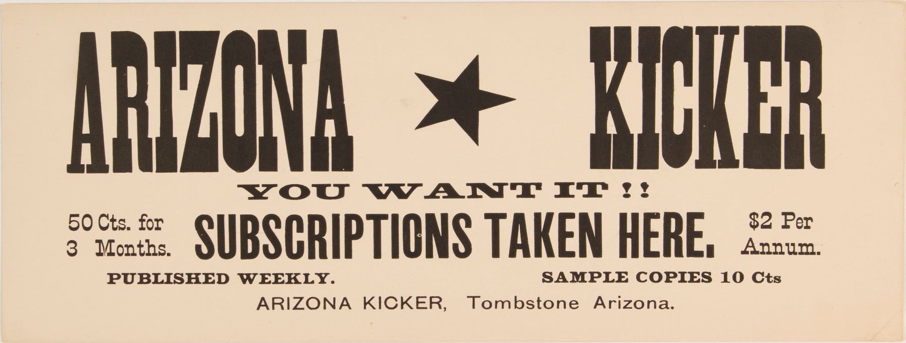 From an early printing co. proof book that contained samples of many print jobs from the 1890's. Actual age of this piece is unknown. A black on cream card for the "Arizona (star) Kicker...50 cts. for 3 months...Published weekly...Tombstone, Arizona". No mention of Territory. However, found with a small group of paper that was "A.T." marked. A quick search shows this newspaper in biz c.1890's. Mint. Date: Location: Tombstone, Arizona HWAC# 53635