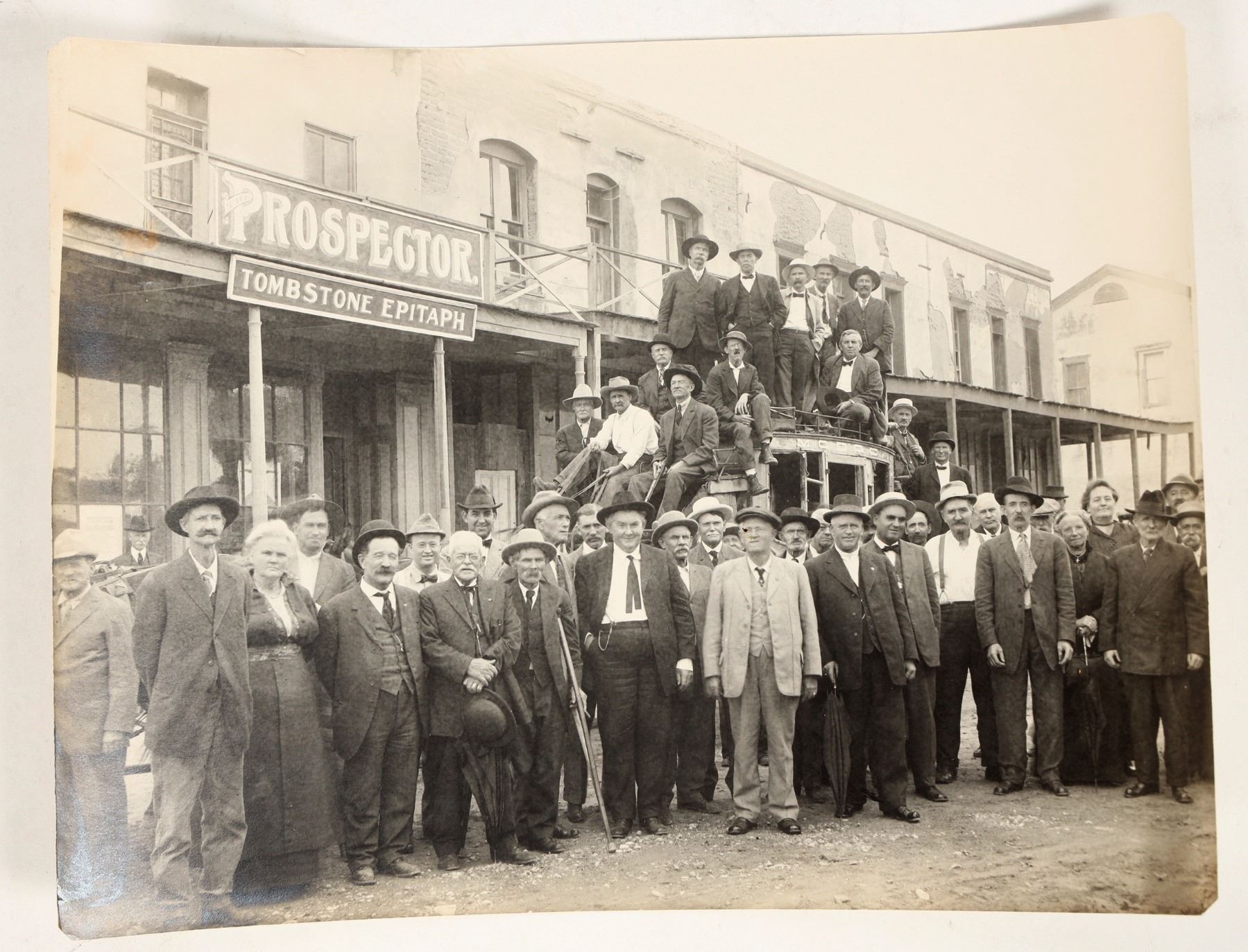Fantastic and rare photograph showing a large crowd posed in front of The Prospector/Tombstone Epitaph newspaper office. 6.25 x 8" Numerous people are posing on a wagon labelled Modoc. The editor is likely the man front and center. No photographer. The back has "Taken in 1915" written in pen. According to William H. Lyon in his book Those Old Yellow Dog Days, Frontier Journalism in Arizona 1859-1912, the Tombstone Daily Prospector was conceived by James Reilly, Joseph Pascholy, Andrew Ritter, and Stanley C. Bagg to offset what "Some powerful Tombstonans suspected" were "sinister forces at work behind the editorial masthead" of the Tombstone Epitaph. The Daily Prospector was established on March 7, 1887, as an independent paper that ran every day except Sunday under the supervision of J. J. Nash and Ridgley Tilden, editor and publisher. William Hattich took over as owner and editor of the Tombstone Prospector in 1895. Since the weekly Tombstone Epitaph had merged with and become the Sunday edition of the Tombstone Prospector two years before, Hattich effectively ran both newspapers. In 1913, Hattich took the Prospector into the future by converting its print presses to power. The paper changed hands in 1914 and became the Tombstone Daily Prospector. Thus, our photo probably dates to 1913.