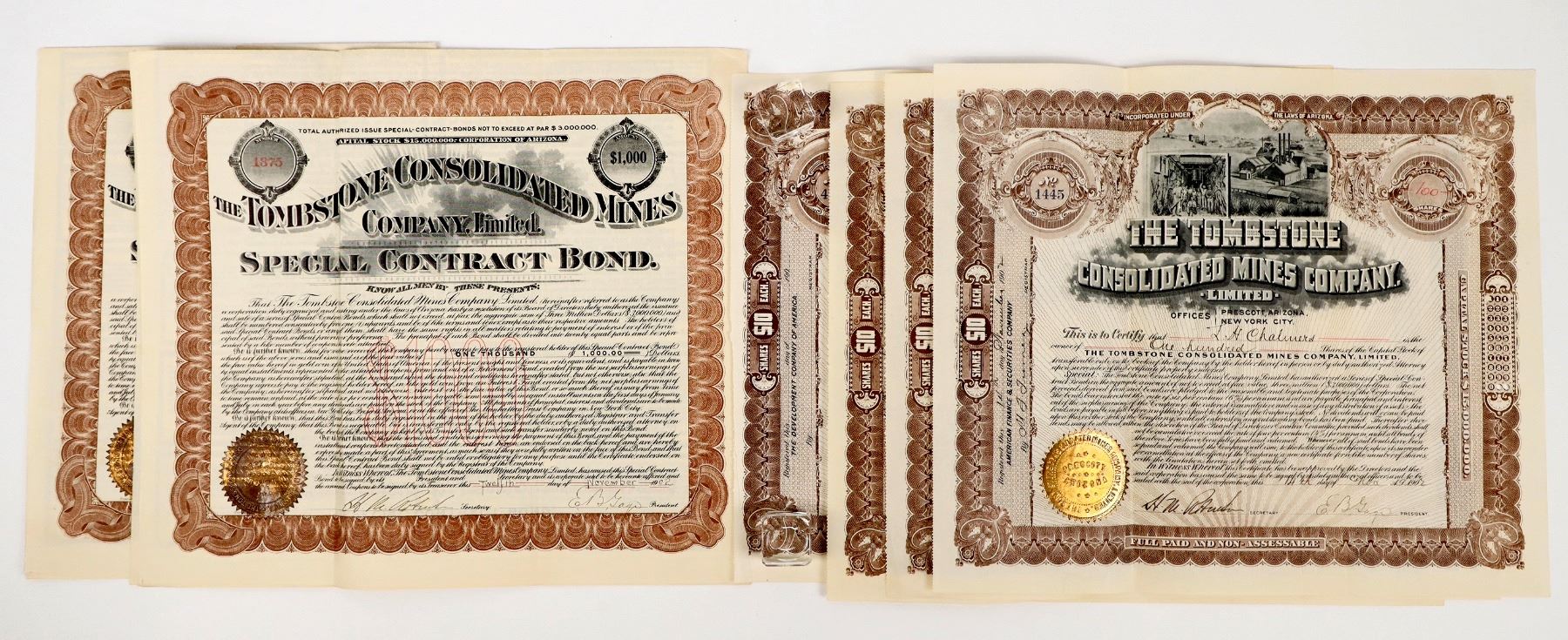 Lot of 3. I/U. Issued 1902. EF cond.. Tombstone Consolidated Mines Co. , $1000, 6% gold bearer bonds with coupons. embossed gold seal. Signed by E.B Gage prominent businessman in Arizona Territory.