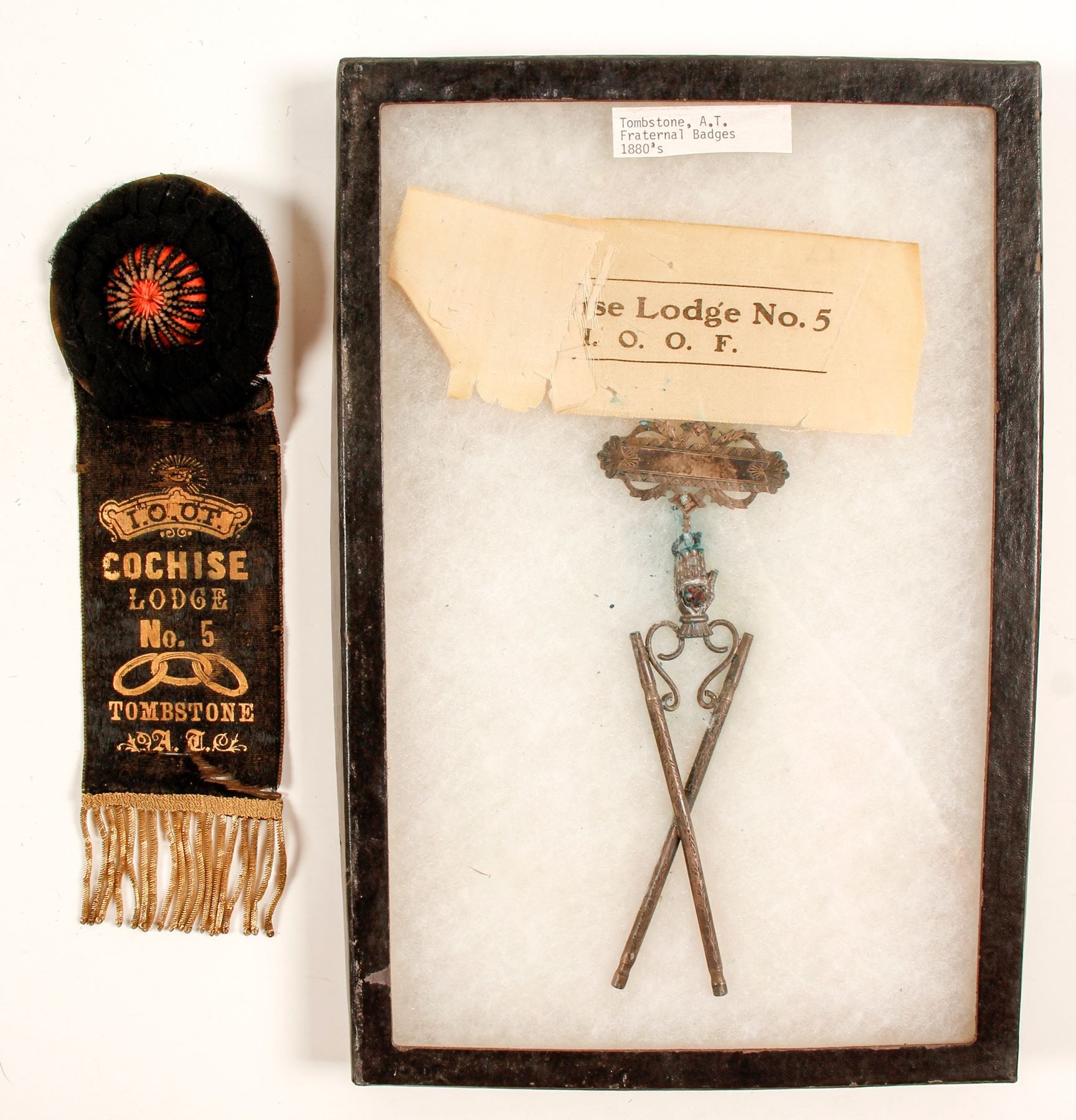 Two Tombstone Lodge Badges. Classic black funerary Cochise Lodge No. 5 IOOF parade badge (9.5"), circa 1885-1900 plus a Cochise Lodge scribe's lapel badge in silver plate (7"). From one of America's great mining camps made famous by the Earp gun fight at the OK Corral. State: Arizona City: Tombstone Date: HWAC# 84871