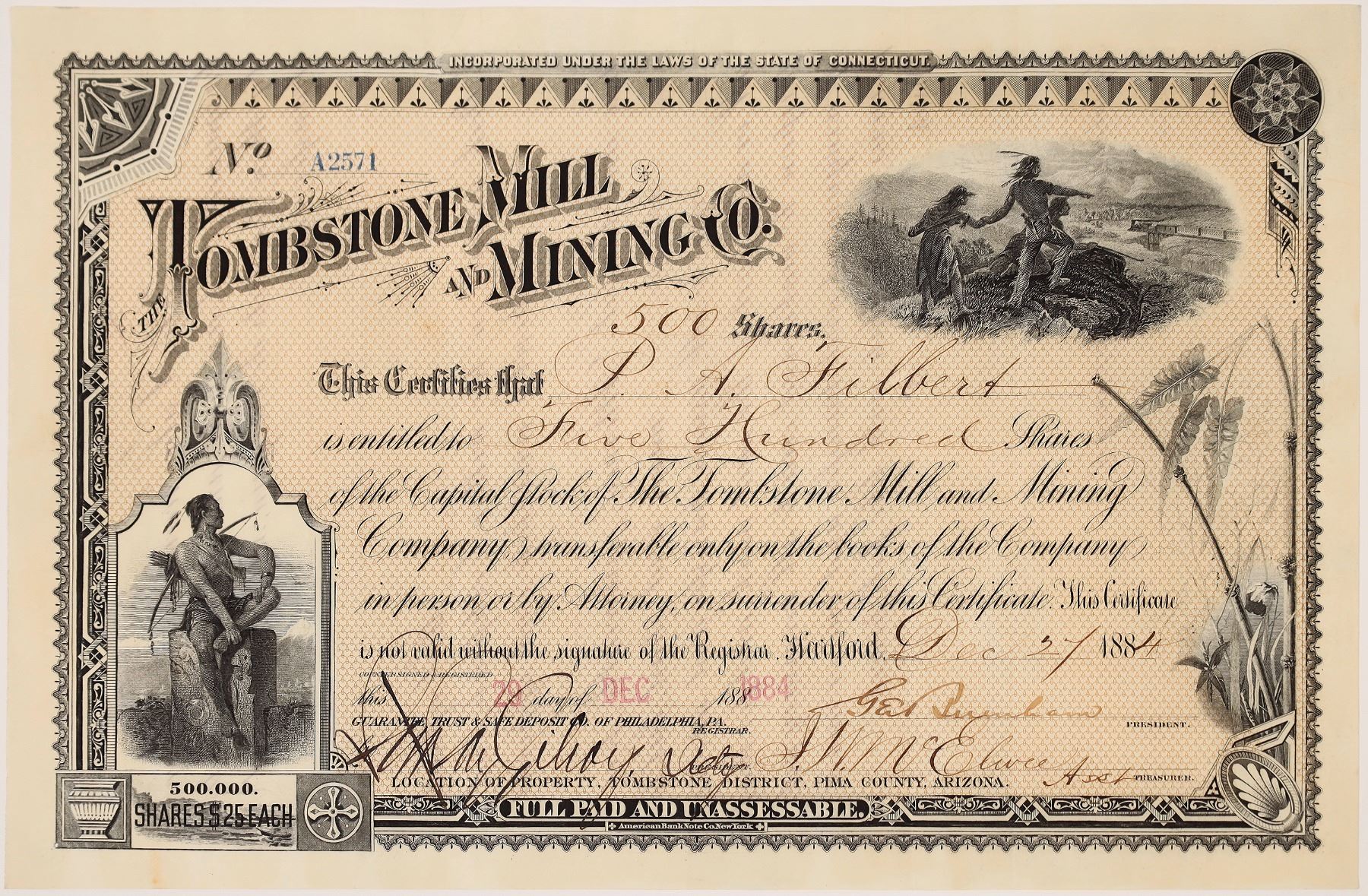 Inc. in Connecticut. No. A2571, issued for 500 shares to PA Filbert on Dec. 27th, 1884. Signed by president Burnham and asst. treasurer JWW Elwee. Not cancelled. Location of Property, Tombstone District, Pima County, Arizona (printed at bottom center). Not cancelled. Vignette in upper right corner of 3 Native Americans on a cliff overlooking a train below; the left corner has scene of a Native American seated, bow over his shoulder. Pale orange background. ABN. 7 x 11" Folds, pinholes. In 1879, Governor A.P.K. Safford visited the camp and, together with Frank Corbin of New Britain, Connecticut, he organized the Tombstone Mill & Mining Company. He commissioned Richard K. Gird to erect a stamp and amalgamating mill, which was completed in 1879. In March 1880, the Schieffelin interest in the TM&MC was bought out by a syndicate consisting of the Corbin brothers and others. Burchard (1883) states that the Tombstone Mill & Mining Company, which comprises the Tough Nut, Good Enough, Lucky Cuss, D tense, Survey, Tribute, West Side, East Side, No.2, Owl's Nest, and Owl's Nest Last Hoot mines, and two mills located at Charleston, with a 30 stamp capacity. It was one of the largest mining properties in the Territory. Its bullion output for the year was $840,000.