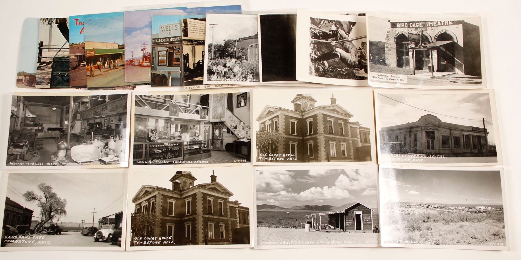 Lot of 19. 12 are real photo postcards. All of the RPCs are not postmarked and only one photographer is identified with a postcard of the Old Fire Department by W.M. Cline Co. The following 7 postcards are all color illustrated images. This lot showcases Tombstones famous and historic sites including the Bird Cage, the Crystal Palace, Boothill Graveyard, the Hangmans Tree and much more! Date: Location: Tombstone, Arizona HWAC# 63800