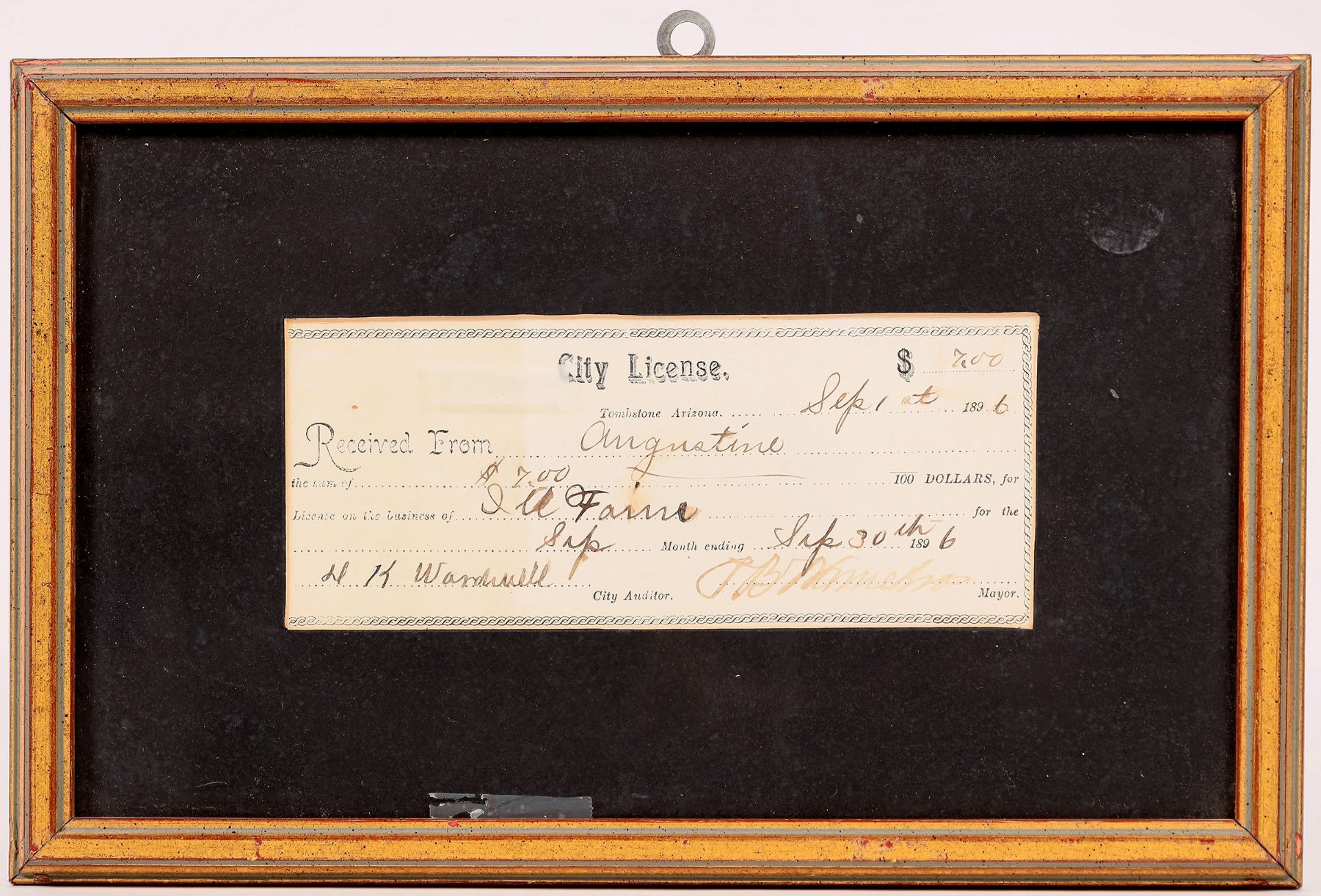 1896 Tombstone prostitute license issued to Augustine for $7. Frame 7.5x11.75".