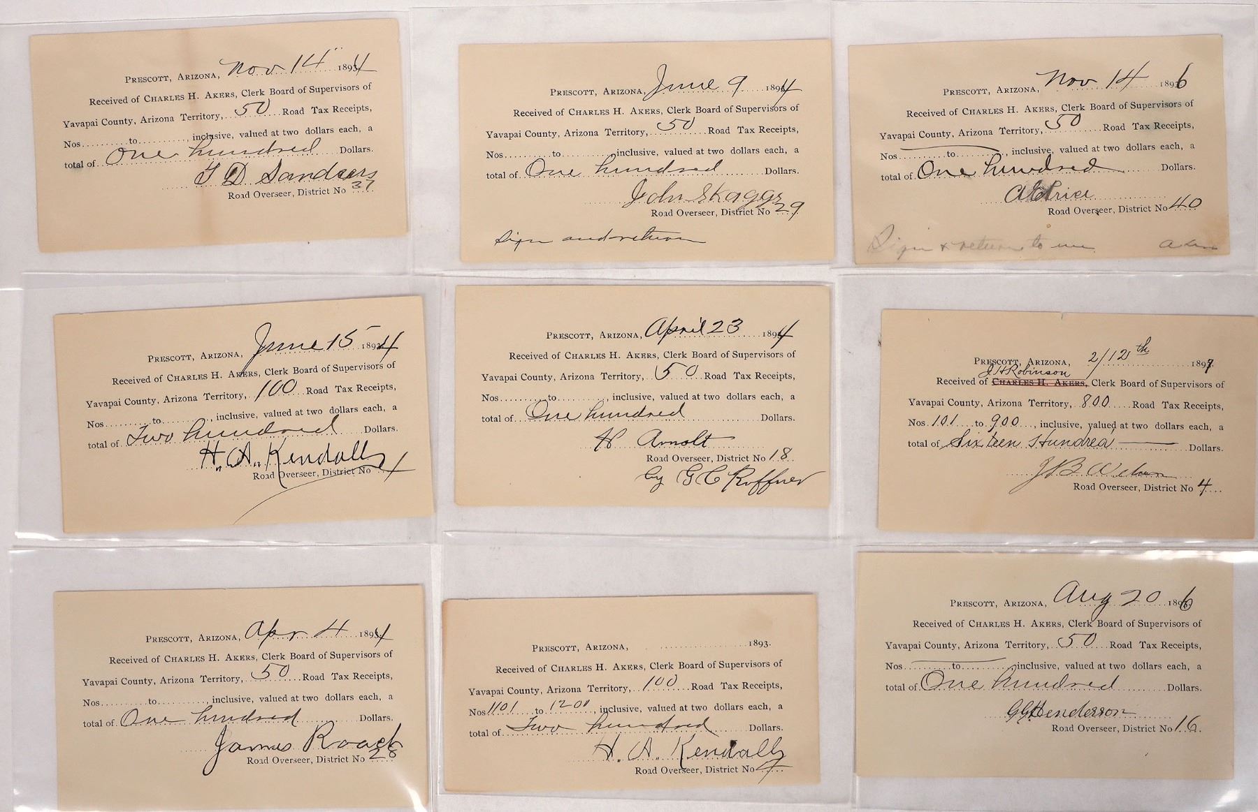 A collection of road tax receipts (9) received of the clerk of the Yavapai County Board of Supervisors Charles Akers. There are also bank receipts from The Bank of Tombstone to the Arizona National Bank. All are in decent condition. Please see photos for more details.
