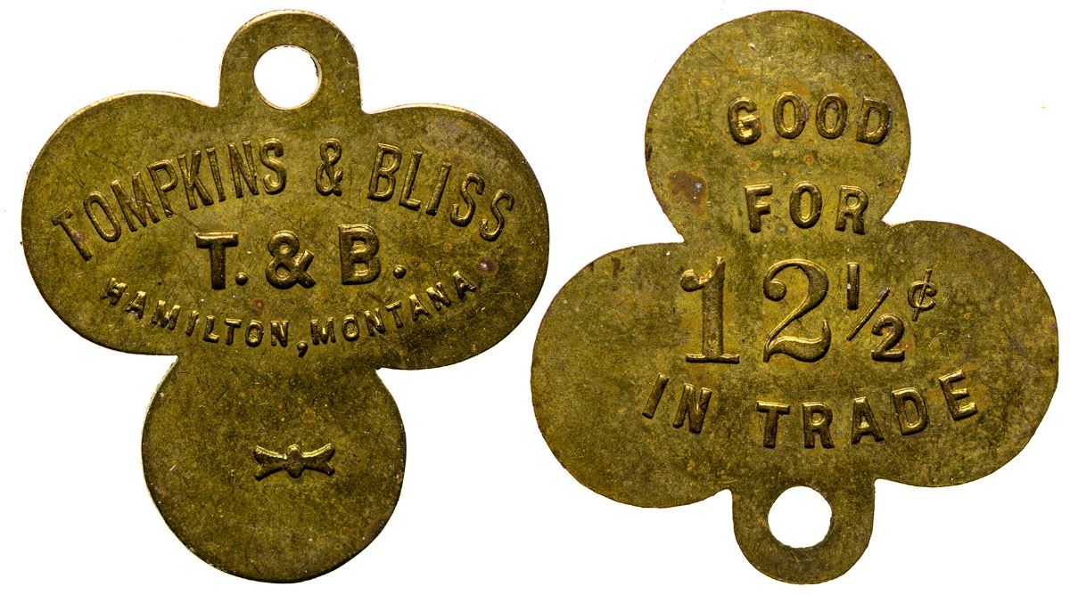 R-8. Tompkins & Bliss / T. & B. / Hamilton, Montana // GF / 12 1/2c / IT. Brass, clover shape, w/ small hole for hanging. (Svoboda Collection) City: Hamilton State: Montana Date: HWAC# 33877
