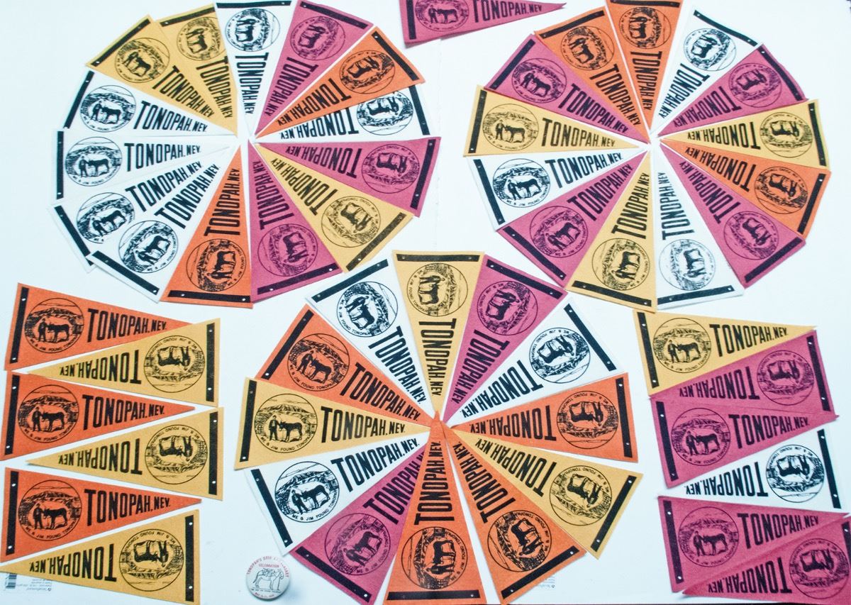 Lot of 52. 51 small pennant banners in yellow, orange, white and red for the celebration of Tonopah’s 50th anniversary May 19-21, 1950. The pennants have a vignette of a man and his burro with the town in the background. Printed under them is the heading “Me & Jim found Tonopah”. Includes one pin from the celebration with the same titling. The pin is black and red ink on white. City: Tonopah State: Nevada Date: c.1950 hwac# 54835