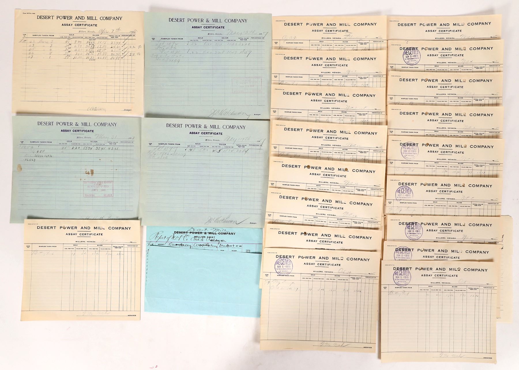 A group of 36 assayer certificates of assay from R.H. Officer & Company, Jameson & Davidovich, Tonopah Assay Office and Electric Shop, The Western Ore Purchasing Company and several more from Desert Power and Mill Company. All in nice condition. Please see photos for more details. Tonopah Nevada Franklin Collection