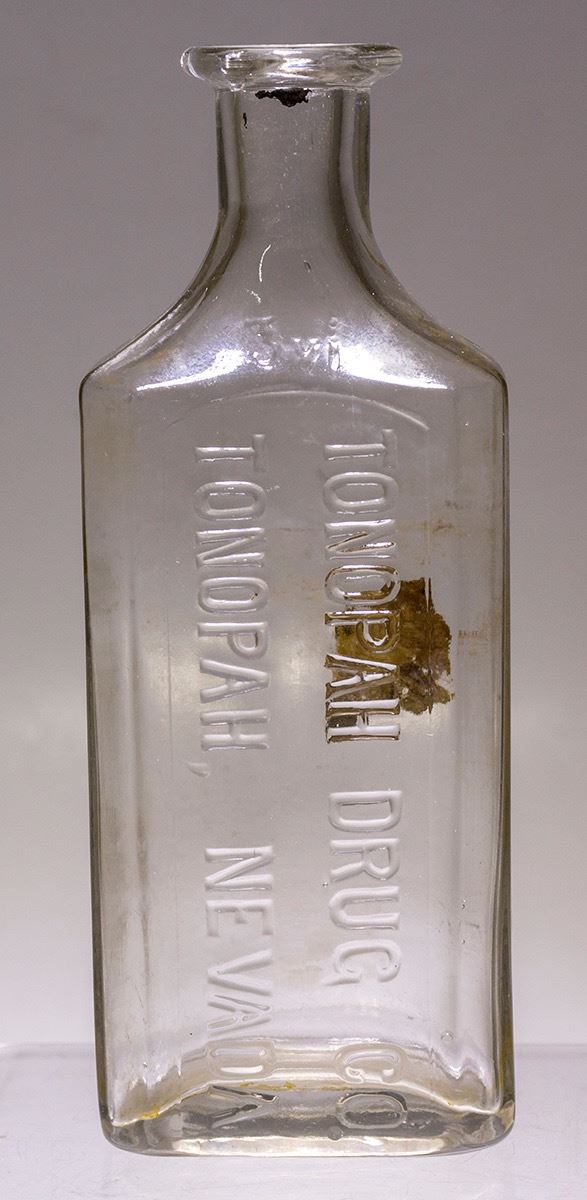This is a six ounce clear glass drug bottle from the Tonopah Drug Company. It measures 6"x 2" x 1" and has a stain on one side. The bottom is also scuffed, but there are no visible cracks or chips. Date: Location: Tonopah, Nevada HWAC# 571835